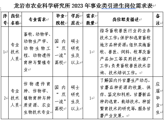龙岩市农业科学研究所2023年事业类引进生招聘公告
