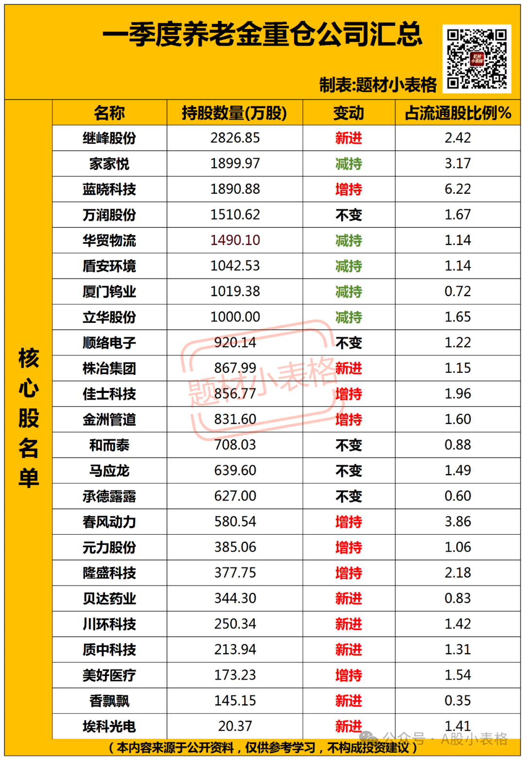 一季度的养老金布局情况已经揭晓,根据最新统计,养老金账户出现在24只个股的前十大流通股东名单中,总计持有2.06亿股,期末市值高达41.12亿元。在持股动态方面,有7只个股新进入养老金账户,同时有7只个股获得增持。