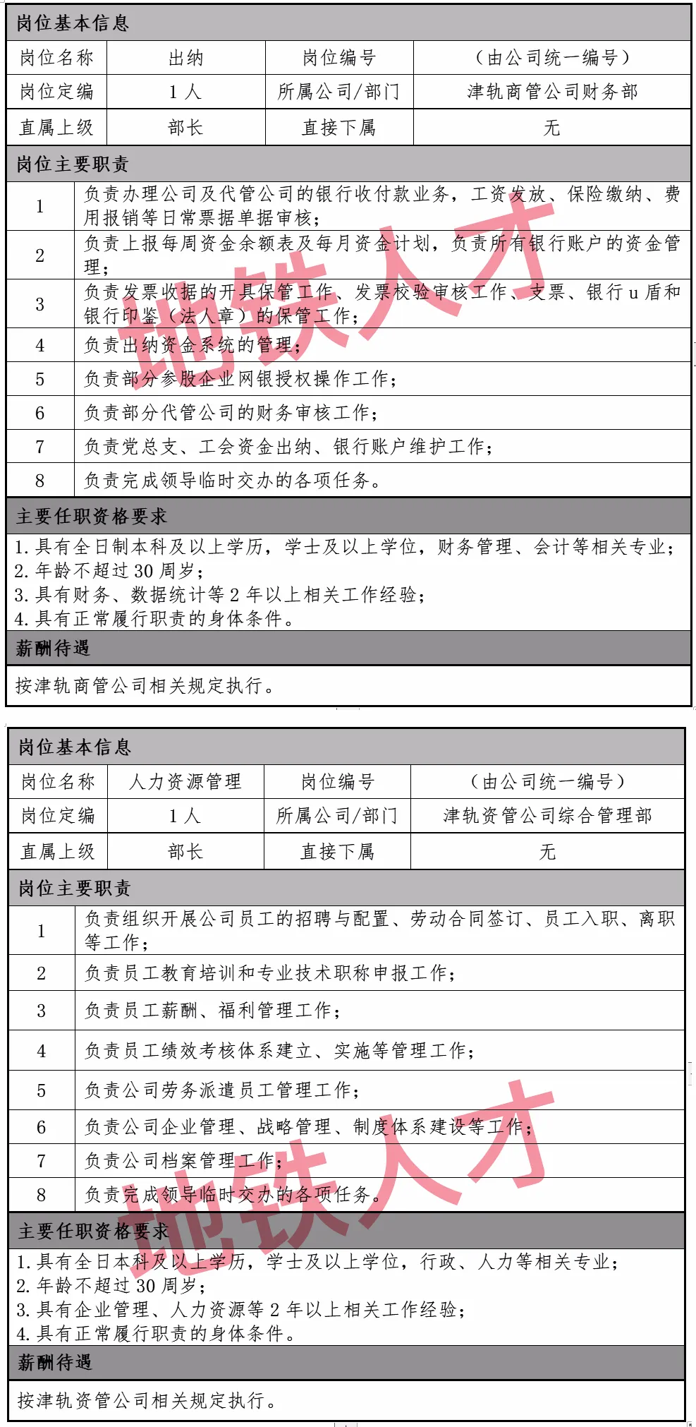本次招聘为一般员工岗位,其中,津轨商管公司出纳岗位1名,津轨资管公司人力资源管理岗位1名。