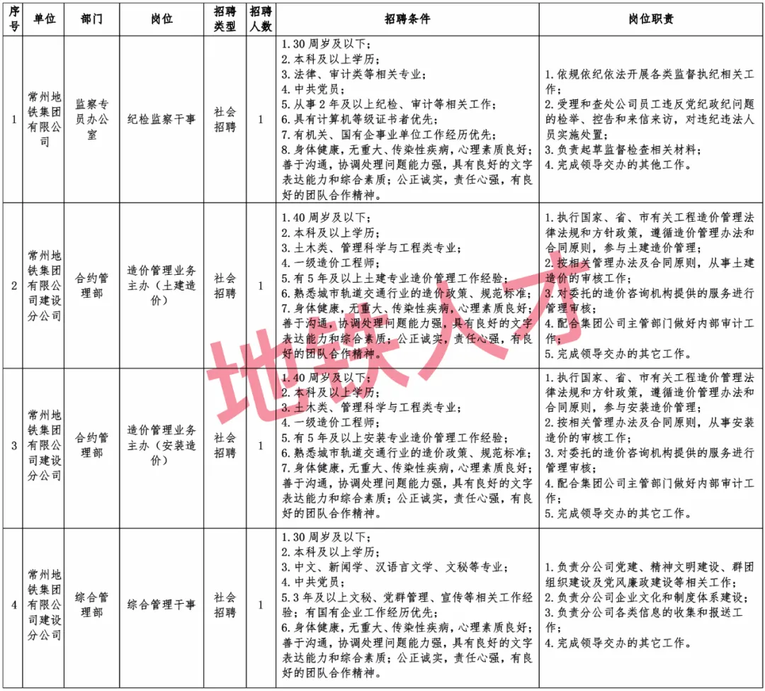 1、4人!常州地铁集团有限公司2024年招聘公告(4.26)