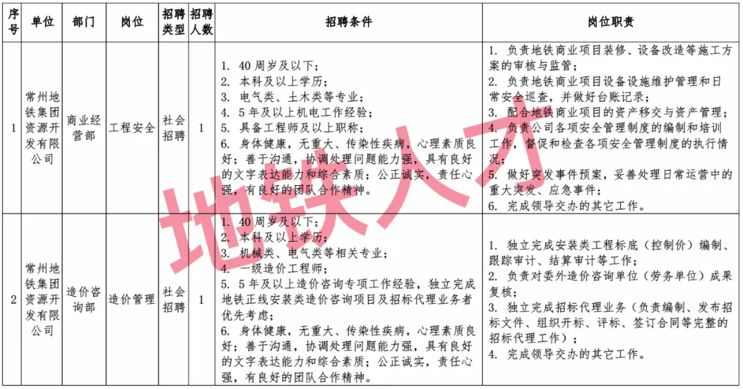 2、2人!常州地铁集团资源开发有限公司2024年招聘公告(4.26)