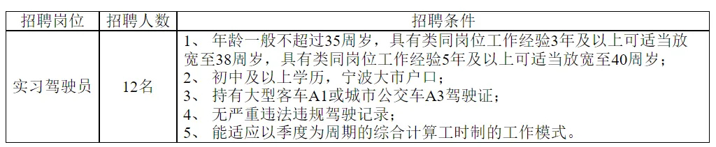 以上招聘岗位要求品行端正、身体健康、勤奋踏实、爱岗敬业,无违纪违规违法犯罪记录及其他职业禁忌的情况。在宁波市公共交通集团有限公司及所属单位范围内,因违反公司规章制度而解除或终止劳动合同的人员不予录用。