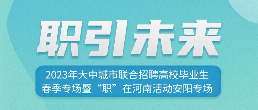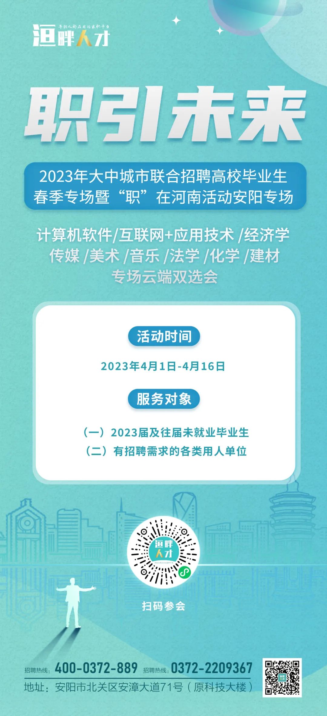 为深入贯彻落实党的二十大精神,落实党中央、国务院和省委省政府关于高校毕业生就业工作的决策部署,搭建高校毕业生和用人单位求职招聘对接通道,促进高校毕业生高质量充分就业,根据《关于开展职引未来——2023年大中城市联合招聘高校毕业生春季专场暨“职”在河南活动的通知》要求,于3月19日至5月26日开展职引未来--2023年大中城市联合招聘高校毕业生春季专场暨“职”在河南活动安阳专场招聘会,欢迎广大应往届高校毕业生及有招聘需求的各类用人单位参会!