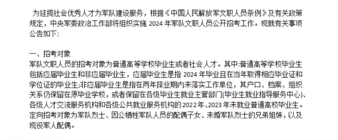 为延揽社会优秀人才为军队建设服务,根据《中国人民解放军文职人员条例》、《军队文职人员公开招考暂行规定》及有关规定,中央军委政治工作部将组织实施2024年面向社会公开招考文职人员工作。现就有关事项公告如下: