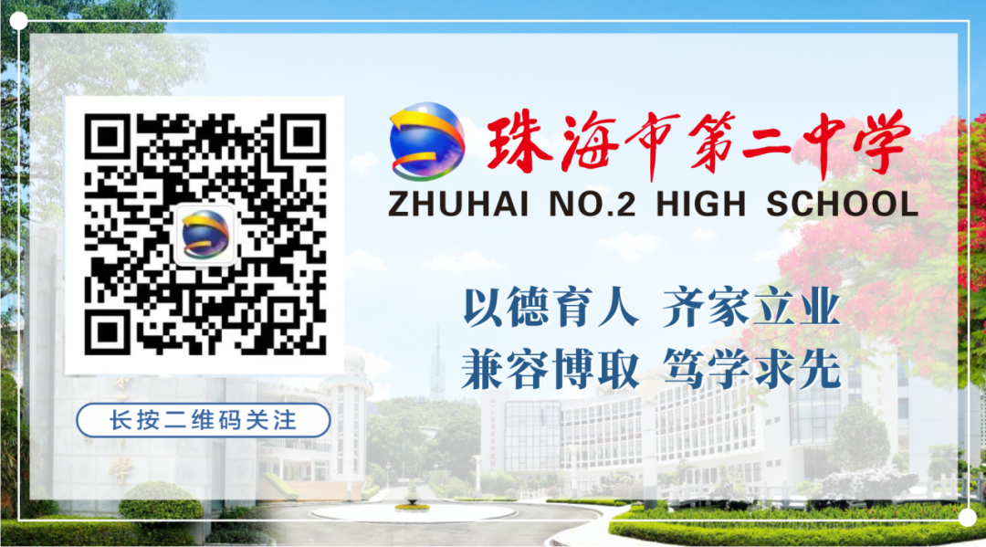 珠海市第二中学创建于1980年,2001年被评定为“广东省一级学校”,2008年被评为“广东省国家级示范性普通高中”,近年来陆续被评为“广东省中小学艺术教育特色学校”“全国学生社团活动创新示范学校”“全国青少年标准化科普教育示范学校”“广东省青少年科学教育特色学校”“广东省第三批普通高中新课程新教材实施省级示范校”等,已成为武汉大学、华中科技大学、西南政法大学、北京师范大学、华南理工大学、华中师范大学、暨南大学等32所高校的优质生源基地。