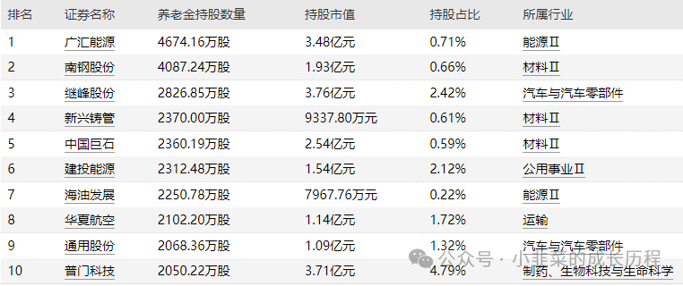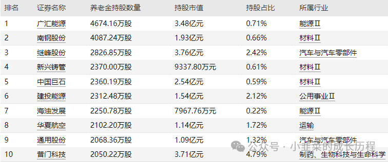 截至4月26日,养老金一季度共现身118只个股前十大流通股东,合计持股9.42亿股,合计持股市值达161.32亿元。其中,36只个股持股数量超千万,广汇能源、南钢股份、继峰股份持股数量居前,养老金分别持有0.47亿股、0.41亿股、0.28亿股。从养老金持股行业分布来看,主要集中在材料Ⅱ、资本货物、技术硬件与设备,分别有20只、20只、16只。