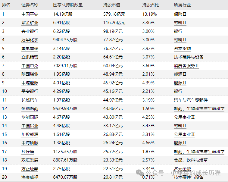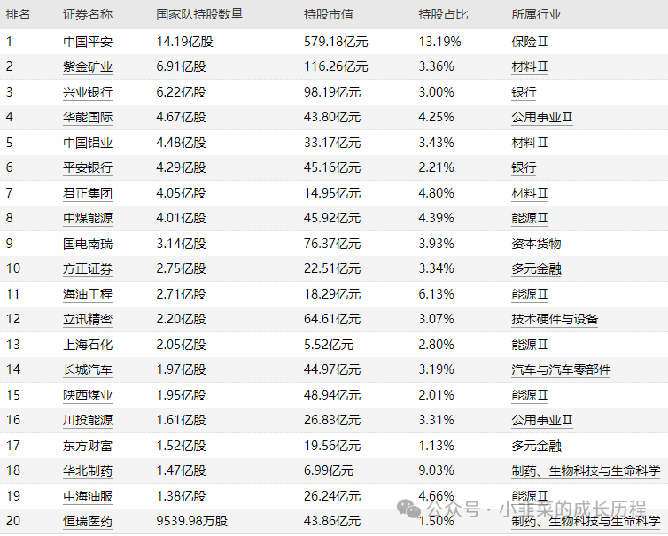 截至4月26日,国家队一季度共现身77只个股前十大流通股东,合计持股87.38亿股,合计持股市值达1742.97亿元。其中,58只个股持股数量超千万,中国平安、紫金矿业、兴业银行持股数量居前,国家队分别持有14.19亿股、6.91亿股、6.22亿股。从国家队持股行业分布来看,主要集中在技术硬件与设备、制药、生物科技与生命科学、资本货物,分别有11只、10只、7只。