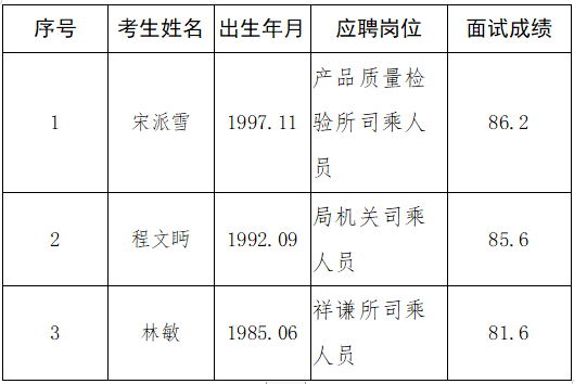根据4月12日《2024年闽侯县市场监督管理局司乘人员公开招聘公告》,截止4月16日共收到报名材料4份,经审核符合面试条件4人,实际到场3人。按照“公开、平等、竞争、择优”的原则对3名应聘人员进行了面试,现对面试合格的应聘人员进行录用公示,
