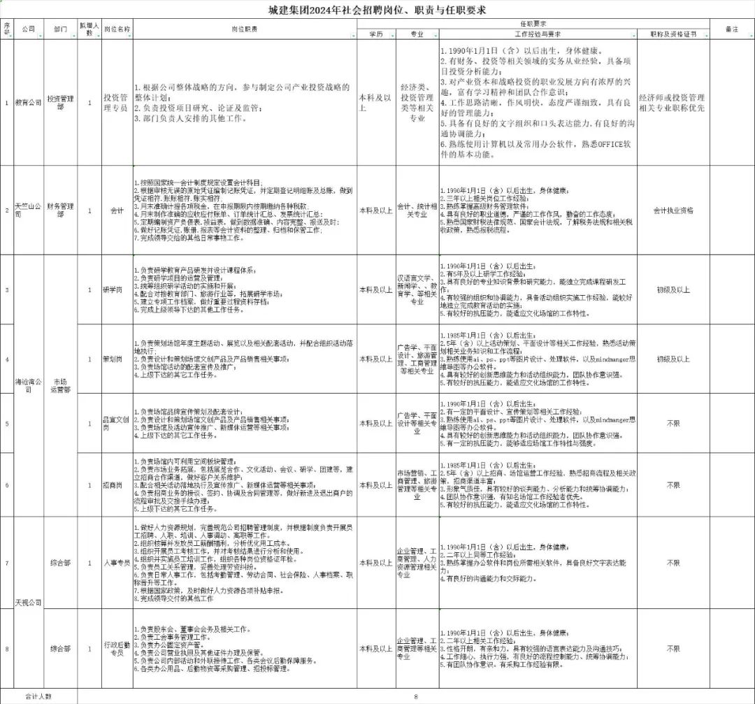 厦门海沧城建集团有限公司成立于2004年8月,是厦门市海沧区国有企业,注册资本金15亿元,资产总额24.09亿元,主营业务包括工程建设管理、城乡维护管理、文化教育体育休闲及其他产业投资开发运营等。根据公司发展需要,面向社会招贤纳才,现就有关事项公告如下: