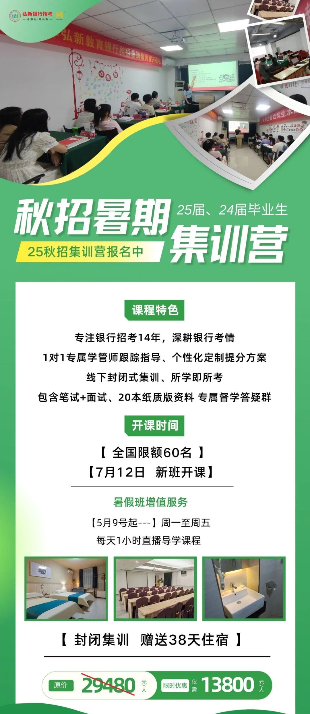 《25银行暑期集训营》 简历优化+笔试+面试都包含 正在火爆预约中 【报名提醒】让你不会错过任何机会。 【网申指导】名师手把手教你写简历,提升网申通过率。 【暑期封闭集训营】17天16晚基础精讲(线下)+测评复盘+速成技巧营(6天6晚)+速成题库营(6天6晚)+复盘测评+面试集训营(线下3天3晚) 【赠送】考前冲刺班(3天)+【赠送】面试集训营(直播或者面授)