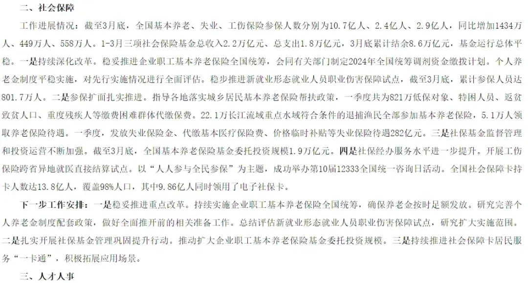 随着人口老龄化的加剧,养老保障问题越来越受到社会关注。而在这个备受关注的话题中,养老金的稳定和增长更是备受瞩目。2024年五一节前,人社部召开了一场备受期待的发布会,宣布了关于养老金的四大好消息,为广大退休人员带来了一丝丝的安慰和期待。 第一好消息:养老金稳健增长在发布会上,人社部透露了关于养老金的最新数据。截至今年第一季度末,基本养老保险参保人数达到了10.7亿人,失业保险和工伤保险的参保人数也有所增加。更为令人振奋的是,社保基金的收入达到了2.2万亿,支出1.8万亿,累计活动结余达到了8.6万亿。这一数据显示,养老金基金运行平稳,结余持续增加,为养老金的发放提供了坚实的保障。 第二好消息:全国养老保险统筹推进全国城镇职工基本养老保险统筹已基本完成,但是统筹工作仍在持续进行中。这一消息表明,政府正致力于进一步完善养老保险的统筹制度,确保养老金的及时足额发放。这对于在职人员和即将退休的人员来说,都是一个好消息,为他们的养老保障增添了一份信心。