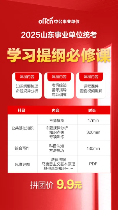 山东事业单位 题型题量如何分布? 命题规律有何特点 今年考题考了啥? 学习提纲必修课 梳理知识纲要 备考指导+专项训练+知识点拨