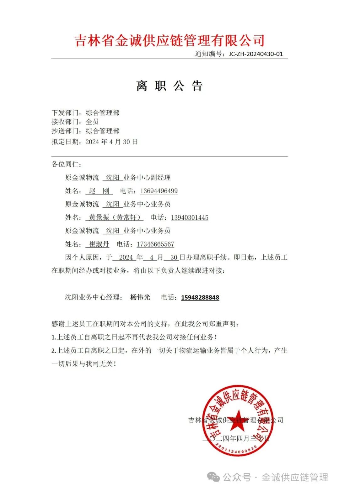 金诚物流公司离职人员公告