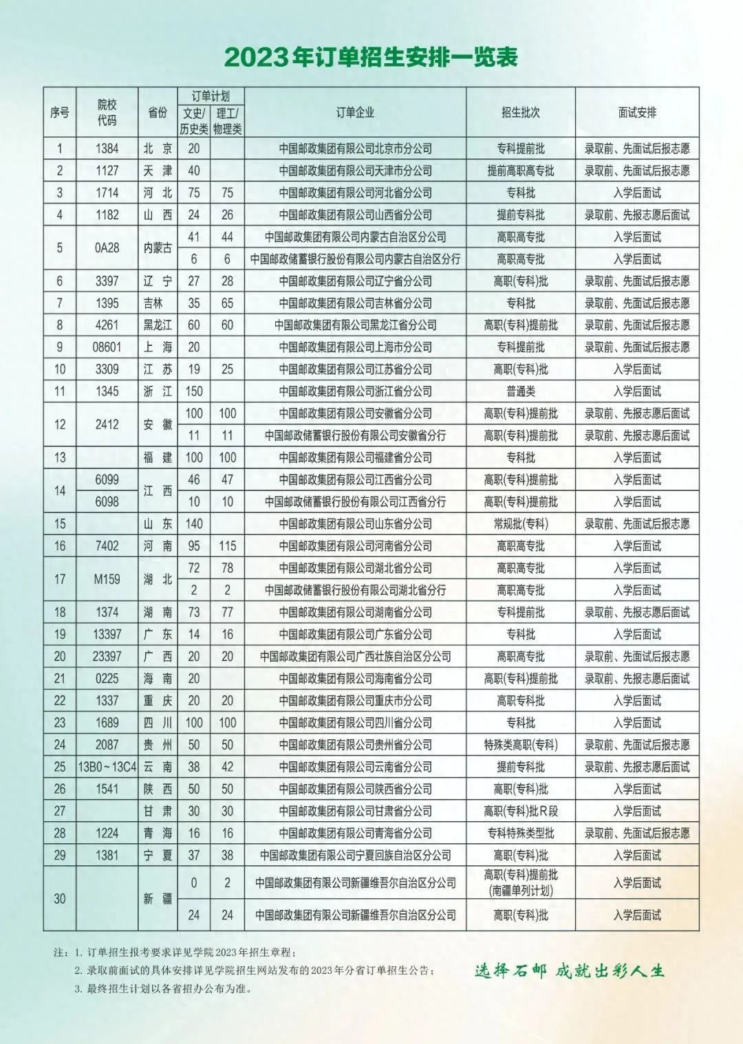 学校的订单班由2004年开始招生,全部面向考生所在省份的邮政企业(邮政公司或邮储银行)基层窗口服务性岗位安排就业(都是定向地点就业,不排除偏远区域)。 想要报考订单招生计划的考生,须参加学院组织的面试,并符合以下要求:注意:订单招生面试分为录取前面试和入学后面试两种形式,面试的具体安排需详见学院招生网站发布的分省订单招生公告。被订单班录取的考生,入学后须参加学院组织的体检,身体健康状况还应符合国家公务员体检标准。