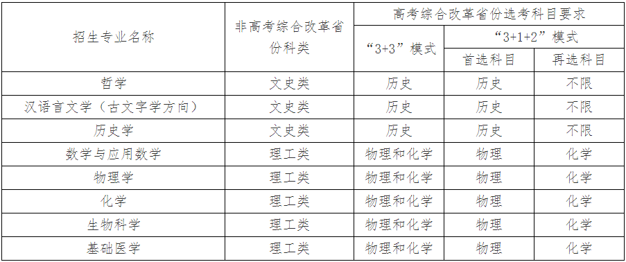 结合学校相关专业优势与办学特色,我校强基计划招生专业为哲学、汉语言文学(古文字学方向)、历史学、数学与应用数学、物理学、化学、生物科学、基础医学。各专业招生科类及选考科目要求如下:
