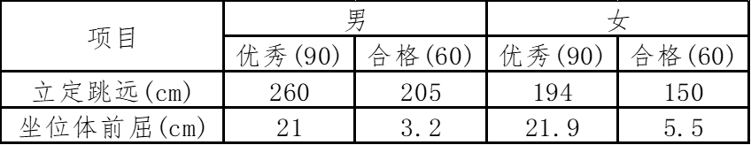 1.体育测试项目为坐位体前屈和立定跳远两项,执行《国家学生体质健康标准》(高三毕业生评价指标)(详见附件),因残疾或重疾等身体原因不能参加体育测试的考生,可凭相关证明免除体育测试,其余考生均需参加两项测试,体育测试成绩不作为录取排序依据,合格即可,但凡有一项测试不合格者即失去参加综合能力测试资格,因临时生病不能参加体育测试的考生,可凭二级甲等以上医院病历办理缓测手续,录取后在新生报到前先行参加测试并合格后方可办理新生报到手续。