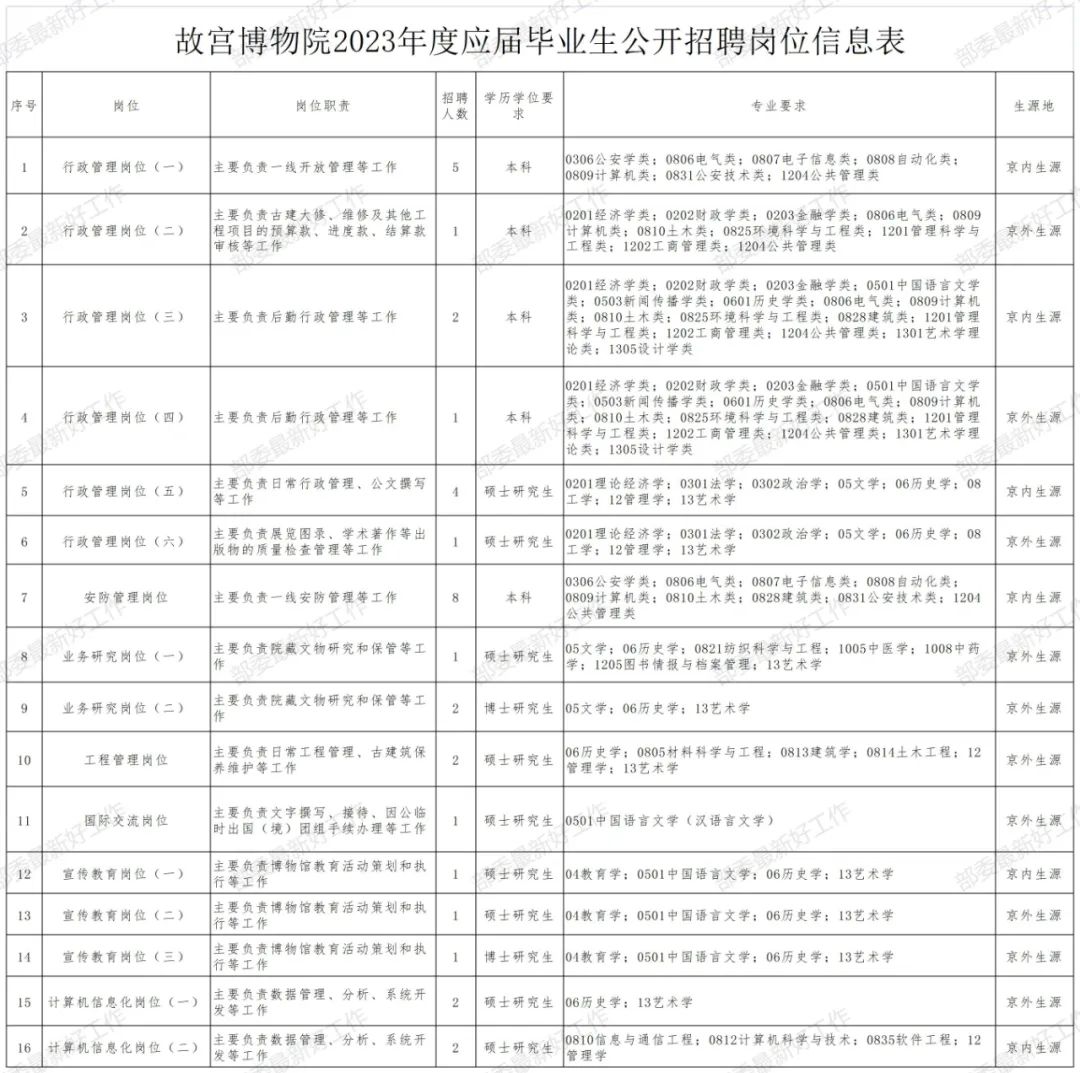 招聘岗位详见《故宫博物院2023年度应届毕业生公开招聘岗位信息表》。岗位学历要求为应聘人员已获得或即将获得的最高学历,岗位专业要求为应聘人员已获得或即将获得的最高学历对应专业。专业参照教育部《普通高等学校本科专业目录(2020年版)》和《学位授予和人才培养学科目录(2018年版)》及研招网最新信息。所学学科专业不在选定的参考目录中,但与岗位所要求的学科专业类同的应聘人员,可主动联系我院确认报名资格。点击查看更多招聘信息