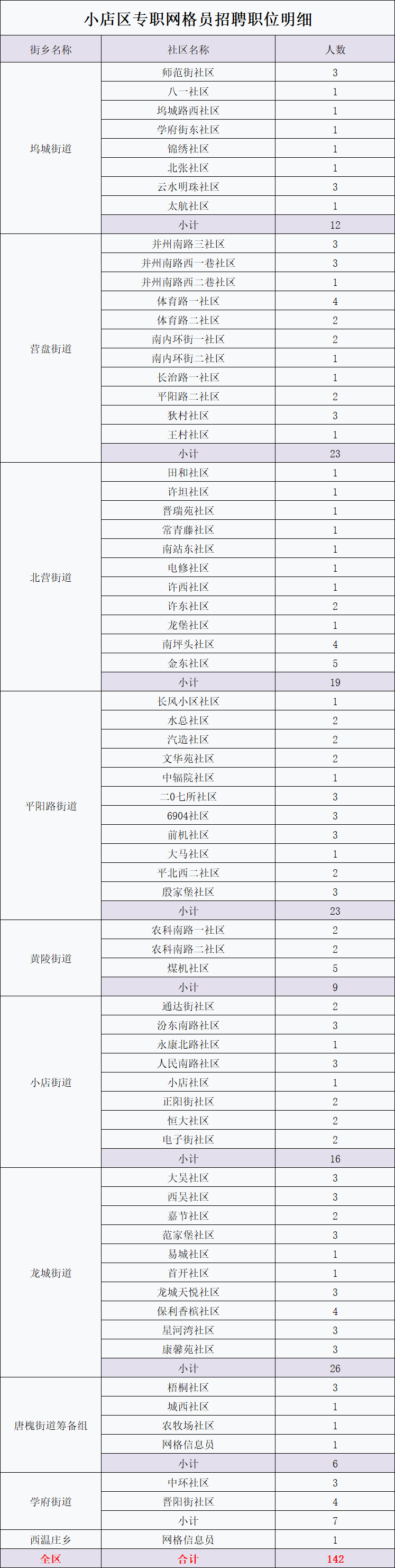 为深入推进全科网格服务管理工作,补齐配强全科网格员队伍,进一步提升基层治理精细化水平,小店区委政法委员会面向社会公开招聘社区专职网格员142名。现将有关事项公告如下: