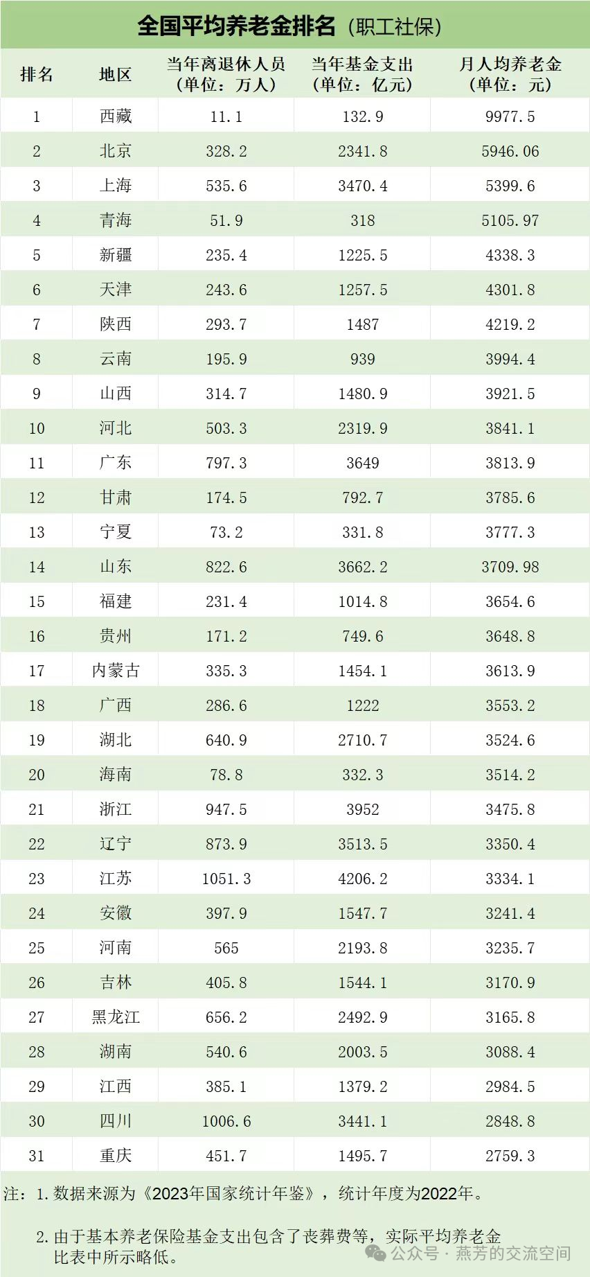| 作者:Yaffin高燕芳,保险从业5年。毕业于华南理工大学,本科数学&硕士应用心理学,美国注册财务规划师&IAIP保险金信托一级架构师。前职为中国移动人力资源主管,现为明亚保险经纪资深合伙人,百万圆桌内阁会员COT,IQA品质服务金奖,中国保险名家银奖。 大家都很关心,退休后到底能领多少退休金。当然,暂时是看不到自己的,那就看看已经在领钱的退休人员的水平吧。 前阵子,热心网友根据官方《2023年国家统计年鉴》数据,统计了全国31省的平均养老金水平。可以一窥究竟、满足下好奇心。 近期大家看到的,就是这张表格了。统计的是:企业职工、2022年度、的平均退休金。居民退休金,咱们后边再讲到。  这个表格,我们来解读一下。 ❶ 全国各省的养老金水平差异很大 第1名的西藏,平均退休金直逼1万元,让人又羡慕又惊讶。 而最后1名的重庆,作为直辖市,近年来发展势头迅猛,却只有2759.3元。 最高和最低,足足相差7218元! 同时看到,浙江和江苏,这些很富饶的省份,平均养老金却在20名以外,在榜单里是后1/3的位置了,也有点摸不着头脑。 ❷ 西藏为什么最高? 第一:西藏的退休人数少。截至2022年末,西藏地区退休人员只有132.9万。 第二:民营经济在西藏相对较少。在西藏工作的,以体制内和央国企职工为主,退休待遇好。 第三:作为地处偏远和工作条件较差的地区,中央财政在基本养老保险上的补助和投入更多。 西藏针对2000年7月1日以后参加工作的人员,缴费满15年退休的还额外有一笔高原养老金补贴。  退休人员少、体制内占比高、有额外补贴。这就不难理解,西藏为什么能甩开北京和上海,稳居第1名的位置了。 ❸ 浙江和江苏养老金为什么低? 另一疑惑:浙江和江苏这两个富裕的省份,为什么平均养老金倒数? 原因扎心:这两个省份民营经济发达! 全国职工社保参保率只有35%,这两个省份的职工社保参保率都在50%左右。高出的占比,其实就是民营企业职工。 民营企业职工的退休金替代率,只有30-40%。而体制内职工,有70%-90%。所以,企业职工参保率高的省份,平均退休金就被拉低了。 广东其实情况类似。 不过,2024年养老金正式并轨(参见文章:2024年养老金并轨)。体制内的退休金,会受较大影响,要向企业看齐了。 ❹ 怎么看待这个排名呢? 刨去特殊情况的西藏、经济发达的北京上海,实际上,各省的平均退休金,都在2千-4千之间。 这里头,又有大量的早年体制内退休、退休金待遇非常好的【老一辈】。 去头去尾去老一辈,实际跟我们比较接近水平的企业职工,退休金不会太可观。 ❺ 最后看下居民退休金 上表统计的是职工退休金。但还有不少人是参加居民养老保险的,全国参加居民养老保险的人数达到5.4亿,比职工社保的5亿还多。 而数据统计:居民退休金平均只有100多元。除了上海1400、北京900,其他省份基本在100-200之间。触目惊心的数据。 以上所有统计和剖析。在我看来,其实都传达了:目前社保退休金并不太高。未来,随着年轻人少、老年人多,缺口越来越大,会有更多不确定和盲盒。个人养老金要搞起,方向不会错。 养老规划和方案咨询,欢迎+V详聊:Yaffinn。我从业5年啦,累计服务客户近800位,数学功底好,认真严谨、专业靠谱、长期从业。 养老规划: 年金产品测评: 存钱和利率: 理赔实录: ❸ 投保4年确诊癌症/重疾赔132万豁免35万/医疗费全报销 ❻ 雇主责任险 | 员工上班期间砸到脑袋理赔1124.53元 了解险种 可抵税的保险: 关于引力团队: — end — 我们是为中高净值客户提供风险管理服务的优质团队 拥有完善培训体系及丰富境内外产品 团队成员多毕业于北大/中大/华工/华师等一流学府 曾就职于500强外企/国企/银行证券等企业 > 欢迎了解加入我们 < 保障产品及方案咨询、请微信我并注明来意