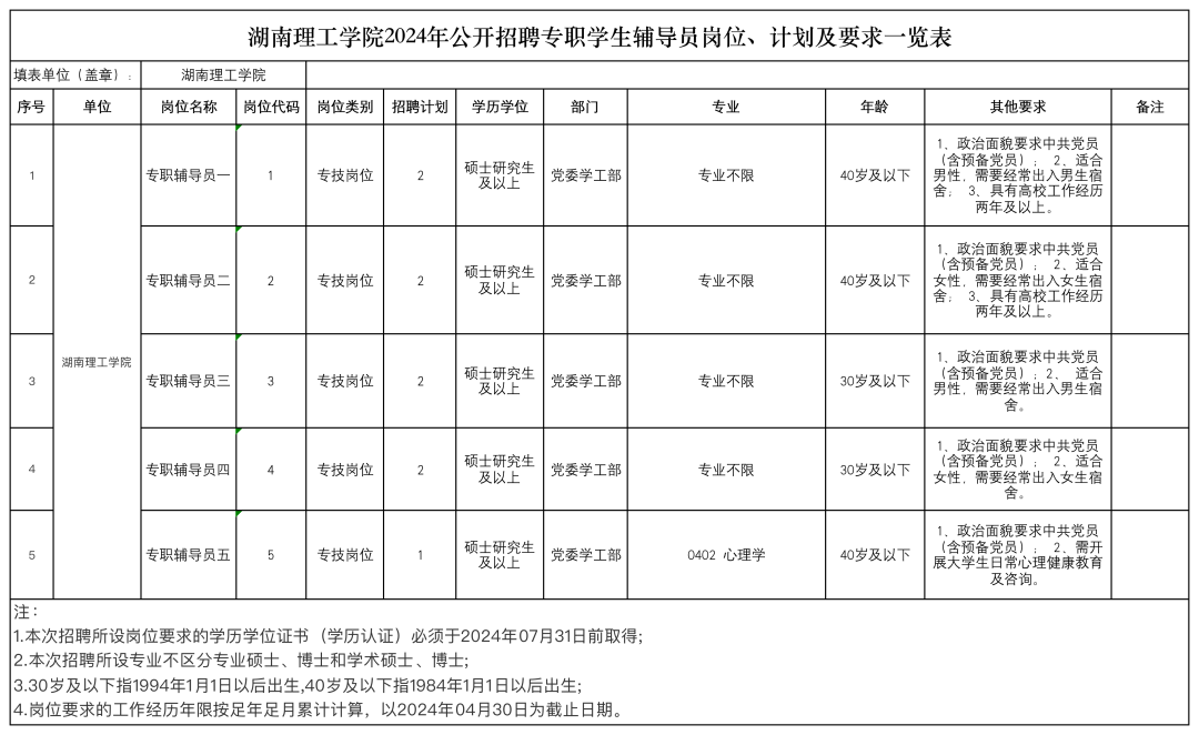 03 湖南 湖南理工学院报名时间:2024年5月9日至2024年5月15日。报名方式:网上报名,每人限报一个岗位,多报则取消应聘资格。应聘人员按岗位要求填写相关个人信息,并按要求将报考岗位所需的相关材料原件扫描整合成PDF文档(命名为“岗位序号+岗位名称+姓名”)发送至招聘邮箱:rsc@hnist.edu.cn。  长按二维码查看招聘信息