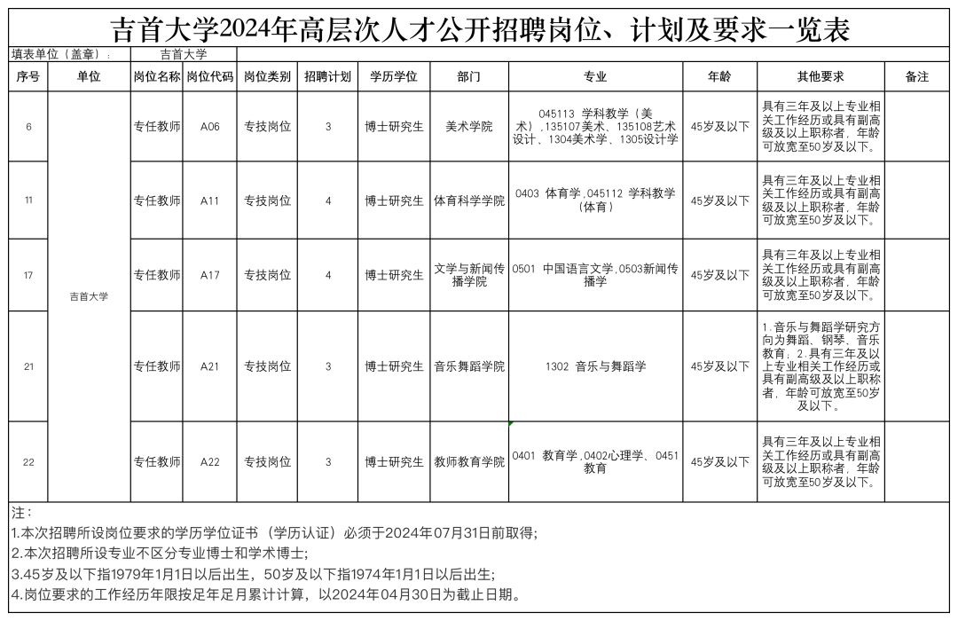 吉首大学报名时间:2024年5月9日至2024年8月31日,随到随招,招满即止。报名方式:采取网络报名的方式。每人限报一个岗位,多报取消应聘资格。请应聘人员登录吉首大学人事处网站,进入“人才招聘报名系统”,按岗位要求填写相关个人信息,并按要求将报考岗位所需的相关材料扫描上传,报名信息提交后不可修改。  长按二维码查看招聘信息