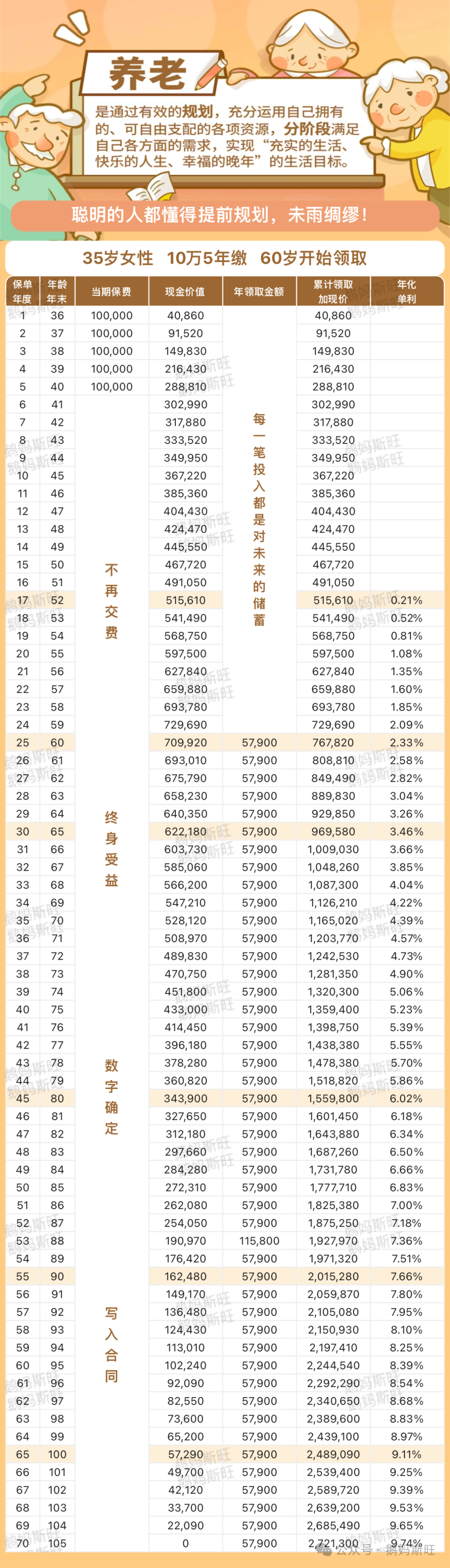 近几年,我国大力推进个人养老金事业发展,随着养老金并轨、延迟退休等等大事的发生,以个人名义,为自己购买个人养老金势在必行! 这一点,无论你是体制内还是体制外,都是一样的。 因为,养老金真的不够了! 个人养老金怎么选? 举个栗子: 35岁女性,每年交10万,交5年,60岁准时领取。