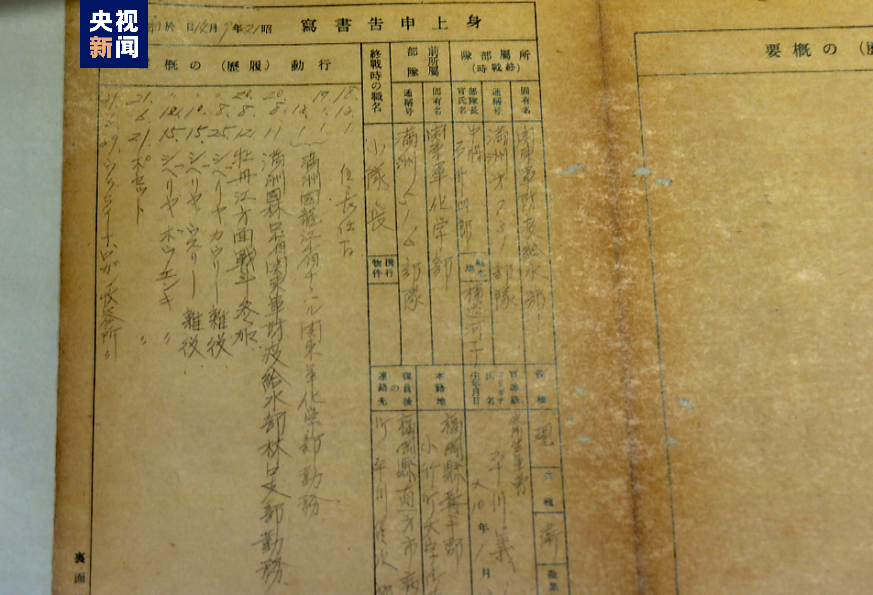 |  侵华日军731部队再添新罪证 近日,侵华日军第731部队罪证陈列馆面向社会公开了一份新近研究发现的档案资料——《731部队本部身上申告书》。
