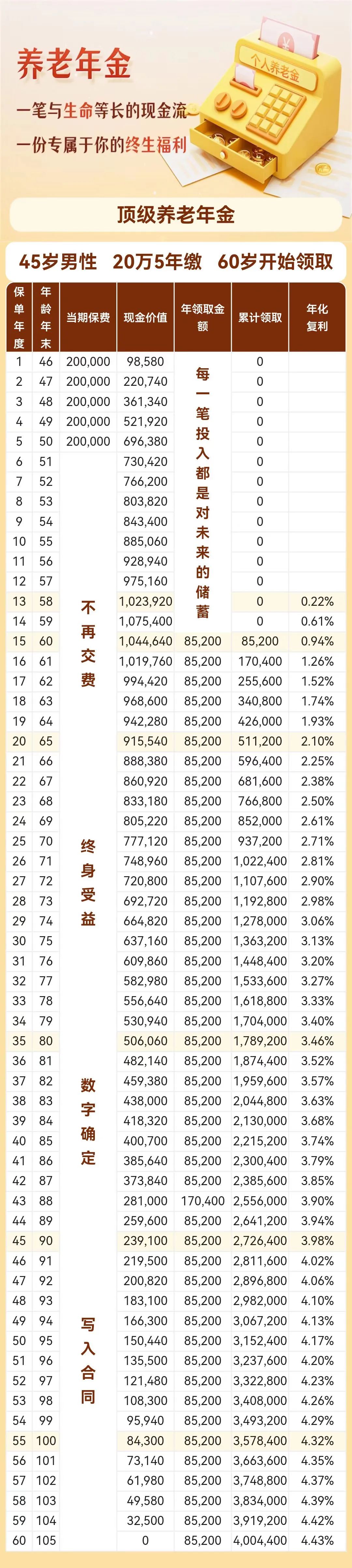 张先生从60岁开始,每年领取85200元,折合每个月到手7242元,再加上社保退休金,每个月至少有一万多块的退休金,小日子过得还是相当惬意的。
