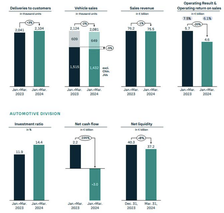 据大众集团发布的最新一季度的财务数据可以看到,一季度大众集团销售收入为 755 亿欧元,低于去年同期的 762 亿欧元;营业利润为 46 亿欧元,同比下降 20%,营业利润率为 6.1%。税后利润37.1亿欧元,同比下降21.6%。对于利润的下滑,官方表示主要受销量下降、不利的产品组合以及固定成本增加影响。对于今年的进展,官方预计 2024 年销售额将同比增长 5% 以上,营业利润率将在 7.0% 至 7.5% 之间。