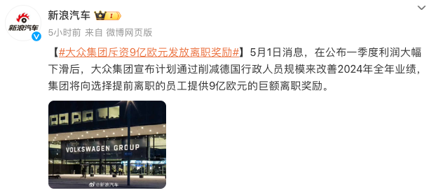 据媒体报道,为了精简人员提振业绩,大众集团将为提前选择离职的员工提供9亿欧元(约69.85亿元人民币)的巨额离职奖励。