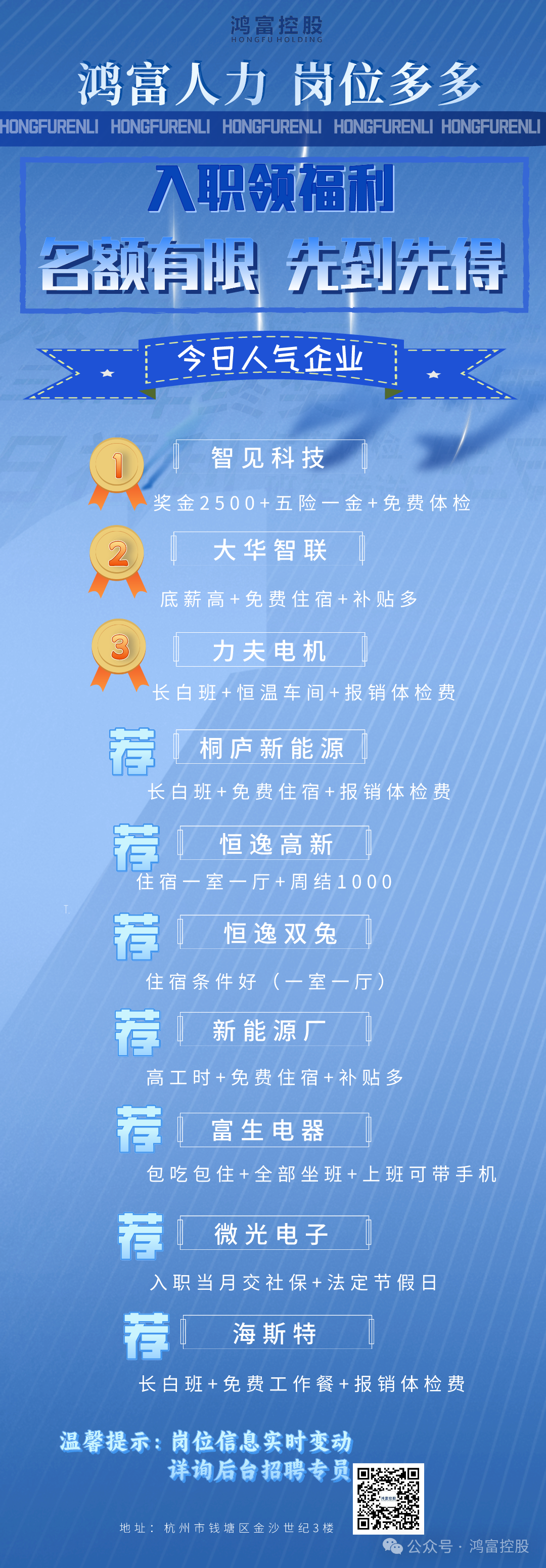 1v1咨询 | 专车接送 免费宿舍 | 入职福利 ![]() 汽车零部件小时工 ![]() ❖岗位待遇 ✦基本工时工资2070 +绩效奖金500~1000(系数最高×1.5) +岗位补贴200-1000 +加班费(工作日1.5倍、周末双倍、法定3倍) +各项补贴 ✦高工时 ✦免费住宿 夫妻外住补贴1000元 ✦全勤200/月 ✦餐补300/月 ![]() 1v1咨询 | 专车接送 免费宿舍 | 入职福利 ☜扫码咨询 主要生产摄像头、监控等电路产品 ❖岗位待遇 ✦基本工资2490+加班21.46元/时+绩效奖+夜班津贴30/夜+高温费 ✦长白班/两班倒可选 ✦免费住宿 ✦餐补17元/天 每月15号发放薪资 ![]() 1v1咨询 | 专车接送 免费宿舍 | 入职福利 ☜扫码咨询 主要生产手机电脑零配件以及手机铰链与医疗器械,车间恒温,环境干净 ![]() ❖岗位待遇 ✦20元/小时 ✦包住宿 ✦包吃 每月15号发放工资 ![]() 1v1咨询 | 专车接送 免费宿舍 | 入职福利 ☜扫码咨询 工作内容:普工、有机加工、CNC等工作经验优先安排 ❖岗位待遇 ✦21/小时 ✦包住宿 ✦包工作餐 每月25日发放工资 ![]() 1v1咨询 | 专车接送 免费宿舍 | 入职福利 ☜扫码咨询 工作内容:①流水线岗位:负责投放叉子,调料包; ②机器操作岗位:辅助机器操作,可来回走动 ![]() ❖岗位待遇 ✦20/小时 ✦包住宿 住宿0押金 体检费可报销 可预支生活费 ![]() 1v1咨询 | 专车接送 免费宿舍 | 入职福利 ☜扫码咨询 招工条件:普通操作工,女生为主,男生少量 ![]() ❖岗位待遇 ✦20元/小时 ✦包住宿 ✦包吃 ✦餐补13.5/天 不体检 ![]() 1v1咨询 | 专车接送 免费宿舍 | 入职福利 ☜扫码咨询 主要生产手机配件 ![]() ❖岗位待遇 ✦底薪2070+岗贴450+全勤150+夜班补贴35/晚+考核工资0-700+激励奖金0-2500元+加班费 ✦免费三餐 ✦缴纳杭州社保,五险一金 ✦体检免费 ![]() 1v1咨询 | 专车接送 免费宿舍 | 入职福利 ☜扫码咨询 工作内容:装配车间,发泡车间,钣金车间 ![]() ❖岗位待遇 ✦22元+包吃 夜班24元+包吃 ✦免费住宿 ✦转正五险一金 可预支工资 ![]() 1v1咨询 | 专车接送 免费宿舍 | 入职福利 ☜扫码咨询 贴标签、包装、检验、打包、操作机器等 ![]() ❖岗位待遇 ✦20元/小时 (夜班有补贴15元) ✦免费住宿 体检费可报销 每个月10号发工资 ![]() 1v1咨询 | 专车接送 免费宿舍 | 入职福利 ☜扫码咨询 普工 ![]() ❖岗位待遇 ✦试用期23元/小时 试用期一个月,转正后25/小时 ✦免费住宿 月工时260左右 每月20号发放薪资 ![]() 1v1咨询 | 专车接送 免费宿舍 | 入职福利 ☜扫码咨询 纺丝卷绕:操作机器,照看机台,卷绕装卸丝卷,工作轻松简单易学 ![]() ❖岗位待遇 ✦20/小时 ✦包住宿 一室一厅 有夫妻房 ✦周结1000 有餐补 ![]() 1v1咨询 | 专车接送 免费宿舍 | 入职福利 ☜扫码咨询 招聘岗位:包装工、质检员、工作简单 ![]() ❖岗位待遇 ✦20-21/小时 ✦免费住宿 2人间 一室一厅 有夫妻房 有餐补 ![]() 1v1咨询 | 专车接送 免费宿舍 | 入职福利 ☜扫码咨询 主要工作是女工包装、质检;男工卷丝(机器生产,人工把卷好的丝拿出来挂架子上) ![]() ❖岗位待遇 ✦吃饭不扣工时 ✦免费住宿 ✦不体检 缴纳社保 ![]() 1v1咨询 | 专车接送 免费宿舍 | 入职福利 ☜扫码咨询