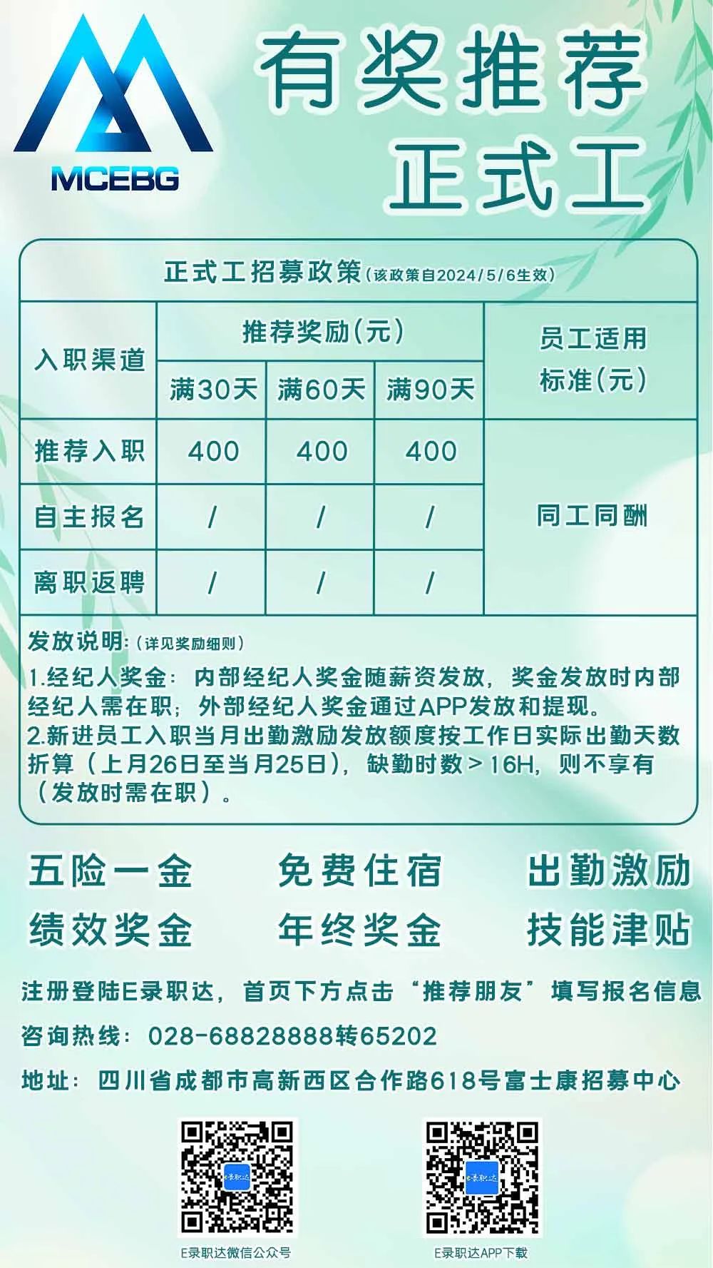 点击蓝字 ![]() 关注我们 ![]() 寻找与众不同的你 ![]() 最新招募信息 MCEBG事业群成都厂区正式工海量招募中 下载注册E录职达app 2024/5/2日即可开始线上报名 政策详情参照下图 ⇩⇩⇩ ![]() 报名方式1-E录职达app ![]() E录职达app推荐朋友 ![]() 「打开APP-推荐朋友-接单-帮报名-填写报名人信息并提交」 E录职达app自主报名/离职返聘 ![]() 「打开APP-普工报名/离职返聘-填报信息及提交」 报名方式2-E录职达微信小程序E录职达 E录职达微信小程序推荐朋友 ![]() 「微信搜索小程序“E录职达-点击进入E录职达-注册/登陆-经纪人推荐-接单—填写报名人信息并提交」 E录职达微信小程序自主报名/离职返聘 ![]() 「微信搜索小程序“E录职达-点击进入E录职达-注册/登陆-普工报名/离 职返聘-我要报名-写报名信息并提交」 报名方式3-现场报名 携带身份证原件于成都市高新西区合作路618号富士康招募中心一楼6号窗口MCEBG现场应聘。 报名或推荐成功后将收到富士康短信通知现场面试报到名时间及面试要求。 🏠报到地址:成都市高新西区合作路618号富士康招募中心一楼6号窗口; ☎️联系方式:028-68828888转65202; 📃面试资料:入职报到当天携带有效身份证原件; ⏰面试接待时间:8:30-11:30,13:30-16:30; 🔍入职体检:入职体检费50元(费用随首月薪资返还) ![]() END ![]() 普工招工,尽在E录职达! 关注我们! 带你了解最新招募咨询! |