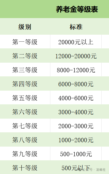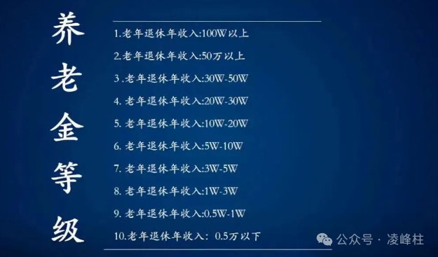 在候鸟式迁徙的自由与舒适中,我们不难发现一种理想化的生活方式——既适合度假,又适宜养老。 然而,这一切的基石,无疑是稳定而充足的养老金。 随着社会的发展,养老金已不再是单一的数字,而是有着不同等级,直接影响着退休后生活品质的多维度指标。 养老金等级概览:近期,一张关于养老金等级的图表引起了广泛关注。它将退休后的年收入分为10个等级,每个等级都是对退休生活品质的一种映射。 年收入作为退休后稳定的现金流,是养老规划中不可或缺的一部分。 现实中的养老金差异:尽管理论上养老金有着明确的等级划分,但现实中的情况却复杂许多。全国职工的平均养老金约为3600元, 一线城市如北京、上海略高,平均在5000元左右。体制内外的养老金差异显著,如北京体制内平均养老金可达10000元,体制外则为5800元。 养老金等级与生活状态:养老金的多少直接影响着退休后的生活状态。以下是几个等级的养老金与对应的生活状态画像: 第一等级:月入20000元以上