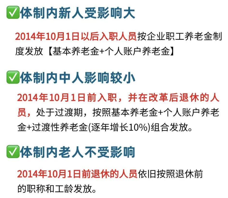 大家好,我是专注养老规划的阿稳。 最近我和身边的伙伴聊的最多的话题就是养老金并轨。 大家可能感觉跟自己没啥关系,但对于体制内的小伙伴来说,今年10月,将会是一个重要的节点,因为养老金并轨将全面实施。 以前父母总想让孩子考公,除了公务员稳定,本身带有“铁饭碗”光环外,最主要的是养老待遇好。体制内的退休金要比一般人的退休金都要高,不信你问问现在退休的原体制内的爷爷奶奶,每月退休金都让别人艳羡。 但是随着社会经济的发展,人口结构的变化,退休老年人越来越多,年轻人越来越少,体制内的退休养老金也会迎来一些变化和调整,养老金并轨就是其中重要一项变动。 01·养老金并轨的前世今生 什么是养老金并轨?有并轨就意味着原先是有两个不同的养老金制度。 这个可以追溯到1991年,我国确立的多层次养老保险制度。里面明确提出了机关事业单位的员工采用虚拟账户制度,由国家财政负责发放养老金;而一般的企业职工实行社会统筹与个人账户相结合的模式,有国家和个人账户共同发放养老金。 这是养老金双轨制的开始。 但是,后来大家越来越发现,双轨制形成了非常大的差距。 过去,体制内退休人员的养老金普遍较高,甚至有些人每月领取过万,而相比之下,企业职工的养老金往往只有几千元,而农民甚至只能领取几百元。 比如我在上海认识的一位退休阿姨,每月光退休工资就有一万多。但是老家的退休农民,每个月能领的养老金只有几百块。这个差距是非常大的。 另外,体制内的公务员和国企职工,尽管缴费年限相同,但大部分养老金都依赖于财政补贴。此外,单位缴纳的比例较高,有些甚至还额外享受企业年金的待遇。 举个例子:2023年全国企业退休人员基本养老金月均3800。全国机关事业单位退休人员月均基本养老金为5800。两者相差两千元,差距达到了百分之52.6%。 要是这个差距是个人原因造成的还好,关键是这个大部分是需要国家财政补贴的。 随着老龄化问题逐渐凸显。预计“十四五”时期,60岁及以上老年人口总量将突破3亿,占比将超过20%,标志着我国正式进入中度老龄化阶段。而到了2035年左右,60岁及以上老年人口将突破4亿,占比将超过30%,进入重度老龄化阶段。 重度老龄化社会带来的挑战是多方面的,其中最为突出的是公共财政压力的日益加剧,这其中就包括社保养老金的开支。 此前中国社科院世界社保研究中心发布《中国养老金精算报告2019-2050》报告预计,2019年全国城镇企业职工基本养老保险基金累计结余为4.26万亿元,此后持续增长,到2027年达到峰值6.99万亿元,然后开始迅速下降,到2035年耗尽累计结余。 现在老人越来越多,年轻人也不愿意孩子了,社保没法一直补贴下去,改革是必经之路。 “养老金并轨”指的就是“机关事业单位工作人员养老金并轨改革”。很明显,是针对机关事业单位工作人员的。 随着大家要求公平的呼声不断高涨,2014年,我国正式对机关事业单位工作人员的养老保险制度进行了改革,就是以后机关事业单位的养老保险制度也转变为社会统筹与个人账户相结合的模式,与企业职工保险制度保持一致。 但是这个如果立马落实的话,就容易引起体制内的强烈不满,不能一刀切,所以就从2014年10月1日开始到2024年10月1日这个时间,用10年来作为过渡期。 02·改革前后,会有什么影响? 简单来说,对于一个公务员而言,养老金制度的改革前后可能会有以下变化: 缴纳方面:改革前可能只需缴纳较少的金额;而改革后很可能需要缴纳更多的养老金,以确保养老金的可持续性和稳定性。 领取方面:改革后领取的养老金会大大减少。 那改革前后,待遇具体会有什么变化? 简单地说就是:新人新办法、中人中办法、老人老办法。 其中,对新人的影响最大。 新人——从2014年10月1日起入职的员工,将按照企业职工养老金制度进行发放。也就是说,他们将享受基础养老金+个人账户养老金的组合发放。 中人——在2014年10月1日之前入职,并在改革后退休的人员,他们处于过渡期。他们将享受基础养老金和个人账户养老金,并且还有过渡性养老金的组合发放。养老金并轨对他们的影响相对较小。 老人——对于在2014年10月1日之前退休的人员,仍将按照退休前的职称和工龄发放养老金。因此,养老金并轨对这些老人并没有任何影响。 03·养老金是怎么计算的? 首先,要确认自己交的是职工养老保险还是居民养老保险。 因为这两个计算方法是不一样的。 职工养老保险就是上班的人有单位给你交社保的情况; 每个月从工资里扣,自己交一部分,公司帮你交一部分。 居民养老保险就是没有工作单位帮你交, 作为居民一年一交的那种,像父母一年交几百块的新农合养老保险就是。 阿稳之前有专门跟大家讲过养老金的计算方法,这里推荐大家用工具测算比较方便,直接微信或者支付宝搜个人养老金计算即可。 04·养老金并轨,我们最应该关心什么? 虽然养老金并轨会影响体制内的退休金,但是短期内公务员的养老金水平仍然具有较大优势。即使在养老金并轨之后,公务员的养老金依然十分可观。 主要是体制内大部分都有职业年金补充,而且体制内缴费基数都很高,都是全额缴纳。另外因为体制内工作比较稳定,缴费年限也会更长,所以退休金还是非常可观。 像近两年,很多人没有工作,或者出现35岁职业危机,这些都会导致社保中断,自然以后退