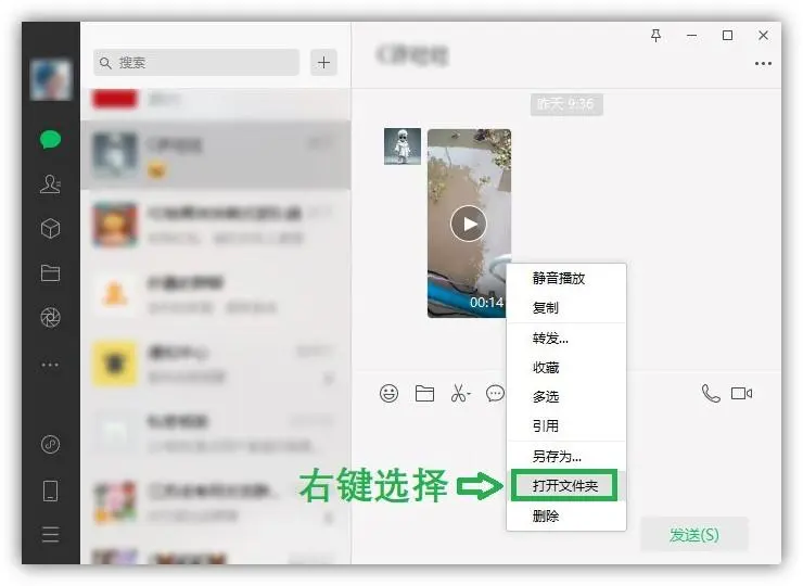 1.在电脑端微信打开一个聊天窗口,翻看聊天记录,随便找一个视频,注意一定要是视频才有效,然后右键选择【打开文件夹】。