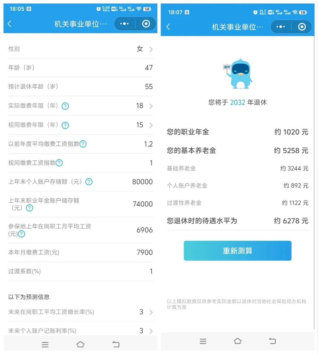 2015年,国务院发布《关于机关事业单位工作人员养老保险制度改革的决定》, 明确要求从2014年10月1日起,机关事业单位工作人员开始缴纳社会保险(包括养老保险)费用,构建与企业职工一致的养老制度,即“养老金并轨”。 为了确保改革的平稳过渡,设置了10年的过渡期。 看似漫长的10年,眨眼就要到了。 想象一下,你辛苦工作了一辈子,终于到了可以享受退休生活的时刻。不管你选择旅游养老还是跳广场舞?都离不开一个关键问题——你的养老金。 养老金并轨就像是一场大变革,它关乎每个人(机关事业单位)的退休生活质量。 养老金的“双轨”时代 过去我们的养老金像是两个不同的跑道,一个是给机关事业单位的朋友们准备的,另一个则是为企业职工设立的。 机关事业单位由国家财政直接拨款,不需要个人缴纳养老保险费。 而企业职工,员工和企业得共同缴纳社保,养老金多少与缴费基数、缴费年限挂钩。 因为这两个跑道有着不同的规则,导致了退休后的待遇也有不小的差别。 后来,政府决定把它们合并成一个统一的赛道,这就是养老金并轨的核心概念。 为什么要“并轨” 由于企业养老保险制度的不完善,许多企业为了规避缴纳义务,往往并未按照员工的实际工资待遇足额缴纳养老保险,导致缴费基数偏低。 企业职工在退休后获得的养老待遇远低于他们退休前的收入水平。 公务员退休后的待遇直接与退休前的工资挂钩,按工作年限计算退休工资,其养老保障更加稳固,待遇水平往往远高于企业职工。 这种长期存在的“双轨制”差异明显有违公平原则,在社会保障领域中引起了广泛的不满与争议。 养老金并轨后,机关事业单位工作人员的养老金将不再与职称、级别挂钩,而是与企业职工一样,按照同样的规则缴纳养老保险,退休后到社保领取养老金。 这意味着,退休后的养老金将更多地取决于个人的缴费年限和缴费金额,而不是过去的职务等级,会更公平。 养老金并轨后,我们的退休金会变少吗? 养老金并轨影响的主要是机关事业单位。别急,让我们来做个简单的数学题。 1.老人老办法:2014年10月前退休的,他们的退休金不变,还按照之前的办法发放退休金。 2.新人新办法:2014年10月后参加工作的,他们的养老金计算方式将与企业职工一致,也就是缴费越多,退休后领的越多。 3.中人中办法:指的是2014年9月30日前参加工作、2024年10月前退休的人员,新老办法结合,哪个算法高,就用哪个。 2024年10月后退休的人员,就完全按照新办法计发养老金了。 你能领多少养老金? 养老金=基础养老金+个人帐户养老金+职业年金/企业年金。 我们每个人对自己退休后能领多少养老金比较好奇,虽然养老金计算公式比较复杂,不过我们可以使用社保局的电子社保卡(点击蓝字查看和测算),模拟计算一下未来退休能领多少退休金。 温馨提示: 由于计算用的数据,很多都是预估的,所以算出来的结果,也只是做一个参考,并不代表实际情况,具体还是要以实际退休为准。 在测算时要用到本地的月平均工资、个人账户余额、缴费年限等信息。 ▼第一步:点击电子社保卡小程序,找到「养老金测算」 点击电子社保卡(点击蓝字进入小程序),进去后在首页搜索框,输入「测算」并检索。 在检索结果中,找到「机关事业单位养老保险待遇测算」,并点击进入。 ![]() ▼第二步:填写基本信息 需要填的基本信息,主要有以下图片上的这些: 2022年各省的职工月平均工资,大家可以参考下图里的数来填写: (向上滑动图片,查看更多内容) 预测信息,只需要填两个: ![]() 这两个都是假设的值,自己定就好。 ▼第四步:点击测算,即可算出退休金 这里以贵阳47岁的A女士,目前月工资8000元为例,预测未来的退休金如下: ![]() 可以看到,测算出来,A女士将于2032年退休,到时候每月退休金约为6278元。 “养老金”并轨后,理论上公务员和企业退休待遇已经在同一轨道上。但实际拿到手的待遇可能还是有差别。 这和制度无关,而是和各单位执行国家政策是否严格有关。