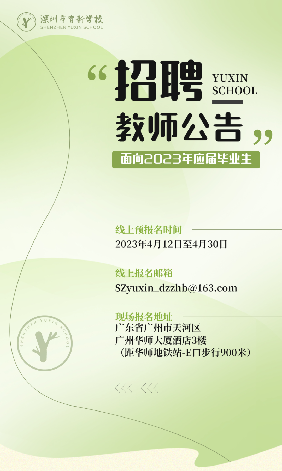 因教育教学需要,深圳市育新学校定于2023年4月面向2023年应届毕业生公开招聘教师岗位7个,拟聘9人。应届毕业生入编后,根据学校“一体两翼”办学模式工作需要统筹安排工作的部门和岗位。现就有关事项公告如下: