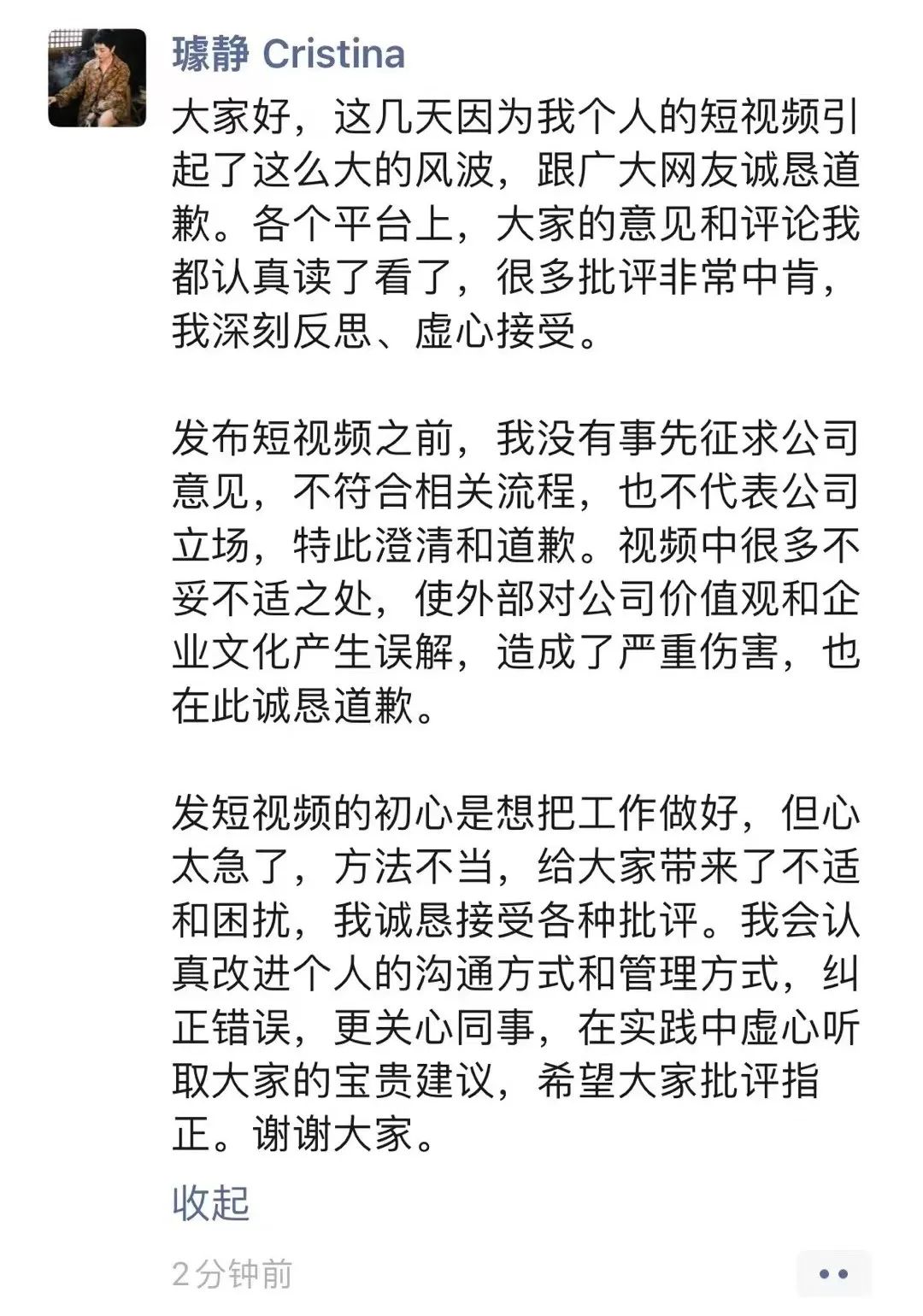 她离职,李彦宏也是秒批么? 真是天道好轮回,苍天饶过谁! 值得一提的是,就在昨晚,璩静还在个人朋友圈对短视频风波事件进行了回应并道歉。