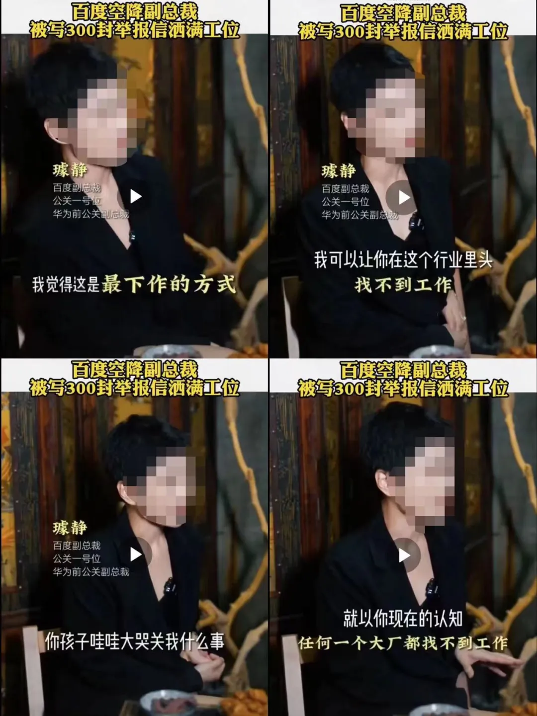 第二条视频更炸裂。 璩静在视频中透露,在她空降百度担任副总裁时,曾遭到下属妻子的300封举报信攻击,这些信件甚至洒满了工位。 在视频中,璩静还说她有能力让对方在这个行业内失去工作机会。