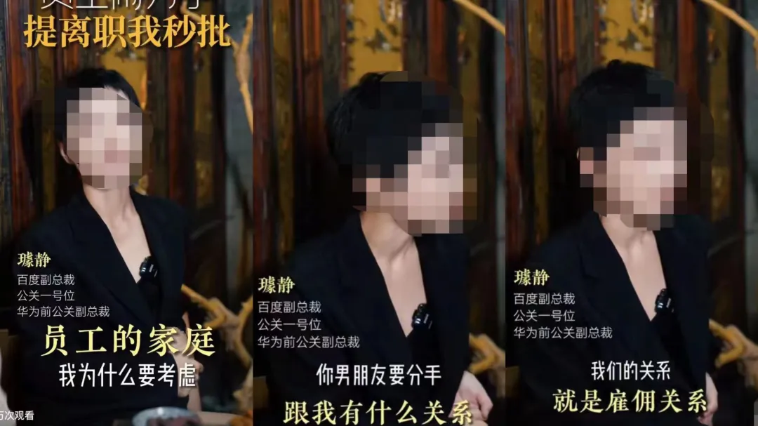 来回顾下璩静的逆天言论~ 5月,她开始发视频。 来头很大,个人标签是:“百度副总裁、公关一号位、华为前公关副总裁”。 只发了4条视频,璩静就火了! 因为说的内容,太刺激。 1、“员工闹分手提离职我秒批”。 她说,和员工只是雇佣关系,没有义务去了解其个人情况。 员工(因疫情)连续出差50多天受不了,和男朋友闹分手等,“跟我有什么关系?我又不是她婆婆?我为什么要考虑员工的家庭?”