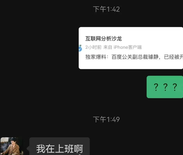 啊这! 虽说百度自己就是干搜索引擎的,但如果真干这事也是不太行吧! 当然,这举报信内容,未必都是真的。 如果这事是真的,猫姐只想问: 彦宏,这事你知道么?! 二、璩静经常半夜还在工作群布置工作,日常还经常采用PUA的工作方式。 其还曾在工作群发送标题为“比亚迪员工猝死在出租屋,生前一个月连续夜班,每班12小时”的文章。