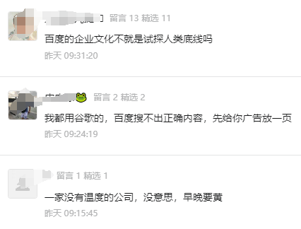 资本向来冷血无情,她说的也可能都是大实话。 上次敢这么说的,还是马云的:996是福报! 不过,连公关老大都是这种论调,百度的文化恐怕也… 你看,粉丝留言~
