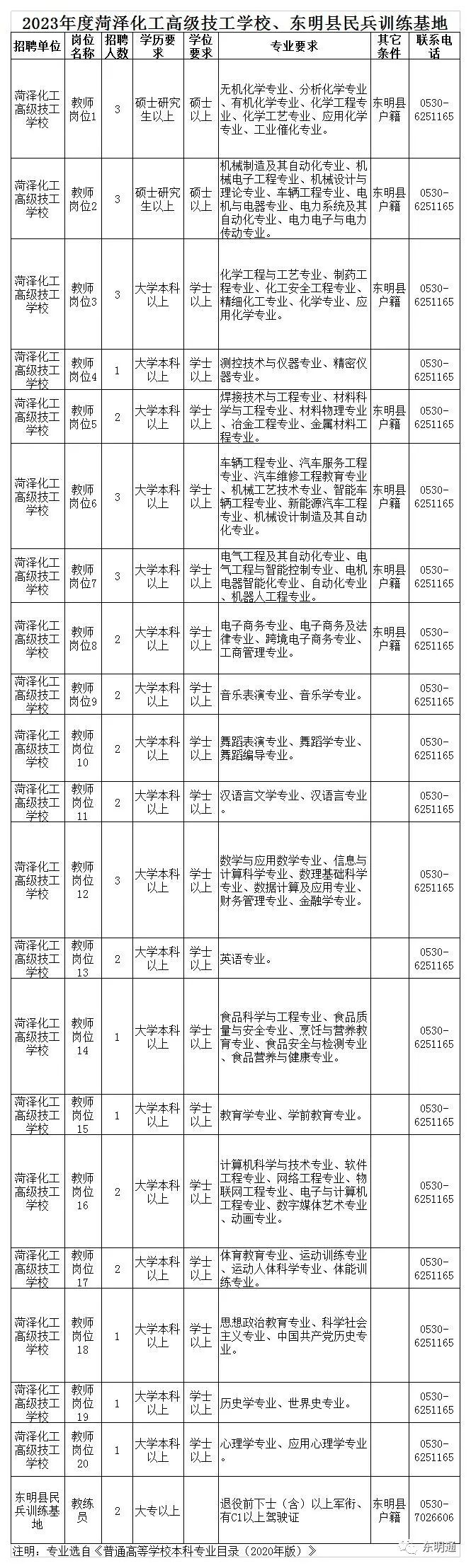 招聘岗位及具体要求,详见《2023年菏泽化工高级技工学校、东明县民兵训练基地公开招聘岗位计划表》。