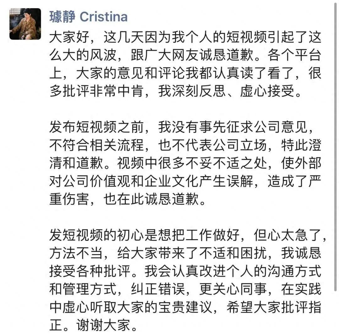 5月9日,连续两天登上微博热搜的百度公关副总裁璩静短视频事件有了最新进展。与前日的强硬截然相反,璩静在朋友圈进行了说明和道歉。璩静表示,发布短视频之前没有征得公司的同意,不符合相关流程,不代表百度立场,特此道歉和澄清。针对引发争议的各种视频内容,璩静称确实有很多不妥之处,使外部对百度的价值观和企业文化产生误解,造成严重伤害,也在此诚恳道歉。最后,璩静表示,心太急,方法不当,给大家造成了不适和困扰,诚恳接受各种批评,并会认知改进个人沟通方式和管理方式,纠正错误,更关心同事。5月7日,百度公关副总裁璩静亲自下场在抖音做短视频,在五一小长假5天发了4条短视频。在视频中有一些比较容易引起争议的言论,包括给下属送手机、奢侈品的包;忘了儿子上几年级;员工闹分手提离职我秒批等等。5月8日,媒体再次爆出璩静在工作群聊天记录的高压语气和在办公室对写负面媒体扎小人泄愤,引发媒体圈胆寒。最终,面对网络的巨大质疑,进而大家对百度的价值观也提出了怀疑。如今来看,璩静道歉自保的举动可能并不能服众。俗话说,树欲静而风不止,无奈传来璩静离职的消息。璩静在五一期间的短视频,引发巨大的争议,归根结底,还是劳资双方如何在企业利益与员工利益之间,想方设法达到平衡的问题。璩静曾在华为任职,后到百度任高管。她能够有这样的经历,说明她学位高、能力强、阅历丰富、经验没的说。但是,就是这样一位嘎嘣脆的美女高管,如今黯然落幕,以一己之力,扛起了责任,令人唏嘘。反观日本企业,员工外出公干,即便返回时,离家近,也不能直接回家,必须先回公司,然后才能下班回家。这样的企业文化是被日本社会认可的,所有人大家都遵从的,公干大于私事。璩静的问题,反映出我们一些社会的现状。大家见怪不怪,反而将璩静不收员工礼物却赠送员工礼物,也拿出来当事说。请问,如果你遇到一个吃你喝你的领导,你又会这样说呢?企业就是企业,公司就是公司,这只是一个人工作的平台。企业提供工作岗位,劳动者提供劳动,只要不违反劳动法,双方就是各取所需。当然,公司除去提供优厚的待遇来吸引加盟者外,给与员工适当的关怀也会体现出人文与关爱。不过,当员工抱怨不能随意休假,不给涨工资的时候,大家是不是也应该想一下,自己又为企业做了些什么呢?而面对动辄辞职、一味的抱怨的员工的时候,如果你是璩静,你是不是也会秒批呢。 |