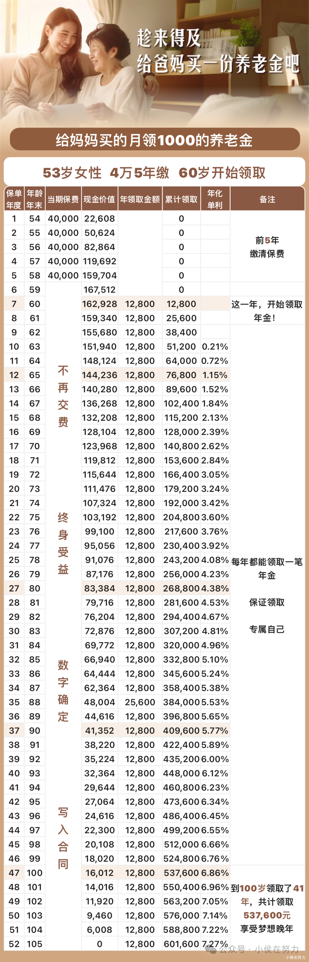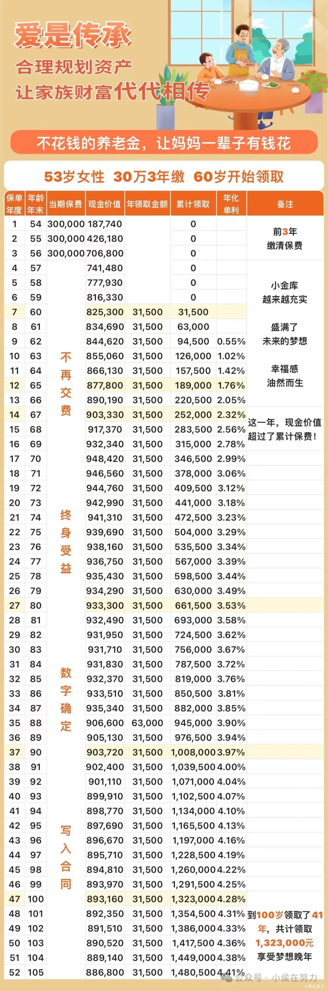 ![]() ![]() ![]() 明天就是母亲节了,都想着给妈妈送个什么礼物,买衣服化妆品,发红包,买金首饰。。。这些可能妈妈会一时开心,可是我们想让她一辈子都开心。 我的妈妈没有社保退休金,今年她53岁,从二十多岁就开始一直在做生意,所以可想而知她没有社保退休金。马上面临55岁退休,我知道虽然银行账户里的钱不少,但是可以看出她还是很羡慕别人每个月的准时到账的退休金。 人老了,总有一天不工作,拥有稳定的现金流,是很有安全感的一件事。 今天给大家分享两款可以给五六十岁妈妈交的养老金。 【按时定额到账】这个月花完,下个月又有,一直有….顶流养老年金,为母"爱"加倍,让妈妈一辈子有钱花。 为53岁的妈妈每年交4万交5年 60岁起每年领12800元,每月领1088元 75岁累计领20.48万,现价还有10.31万 88岁累计领38.4万,现价4.8万 活多久领多久,终身领取,幸福一辈子。 这笔钱安排给到父母养老,不会太多,但是总比没有强。更重要的是让父母和我们的心里更踏实。 【不花钱的养老金】每月领取养老金的同时,本金一直在。 为53岁的妈妈投保30万3年交, 60岁起,每年领取3.15万,每月领取2677元。 75岁累计领取50.4万,账户余额是93.9万。 88岁累计领取94.5万,账户余额为90.6万。 这个产品从67岁开始,账户余额始终保持在90万,也就是我们的本金一直都在。 我们把存在银行的钱换成养老金,相当于我们用的是利息在养老,可以确定一直领,领一辈子。 遇到需要钱的时候,再退保拿出来就行了。 进可攻,退可守,对妈妈来说,这份踏实感和幸福感是其他方式无法比拟的。 父母养我小,我养父母老。养老金,只要活着就可以一直领钱,一辈子源源不断的现金流。 每个家庭的情况不一样,年龄,预算都不尽相同,丰俭由人。相同的是我们长大了,也可以成为妈妈的避风港。明天就是母亲节了,不妨给妈妈一份特别的礼物。既尽了孝心,也没多花钱。只是用对了工具,结果就大不同哦。 如果你有规划养老金的想法,不妨找我聊聊。 电话18931381310。 |