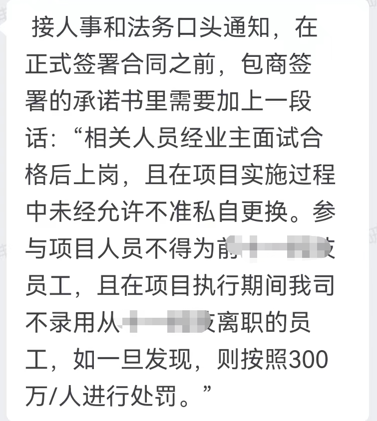 说在前面 由于计成每天都在说大实话 触了许许多多的人的霉头 所以不断被请喝茶、关黑屋 为了防止失联 我们将用“计小成”作为防失联号! 请大家点击下方卡片关注! 失联时请到“计小成”找我们! 预先声明:为保护投稿人,将基于现实对部分投稿信息进行改写。近日,据粉丝爆料,XXCY设计院SH分公司发布通知——配套的包商如果有用该院离职的人员,直接顶格处罚!该院管理层通知全体员工:接人事和法务口头通知,在正式签署合同之前,包商签署的承诺书里需要加上一段话:“相关人员经业主面试合格后上岗,且在项目实施过程中未经允许不准私自更换。参与项目人员不得为本院前员工,且在项目执行期间我司不录用从本院离职的员工,如一旦发现,则按照300万/人进行处罚。简而言之——“你只要从我公司离职,就别再想吃这碗饭!”员工离职后,单位可以拒绝再次录用该员工,但禁止其他单位执行本院项目时录用本院前员工这一说法还是少有耳闻的。本院不留人,在承包单位混口饭吃的机会都不让?这是对离职员工持有偏见,还是心有芥蒂怕留下“后患”?据网友爆料,该院加班强度、薪资待遇和繁琐的手续也诟病重重。