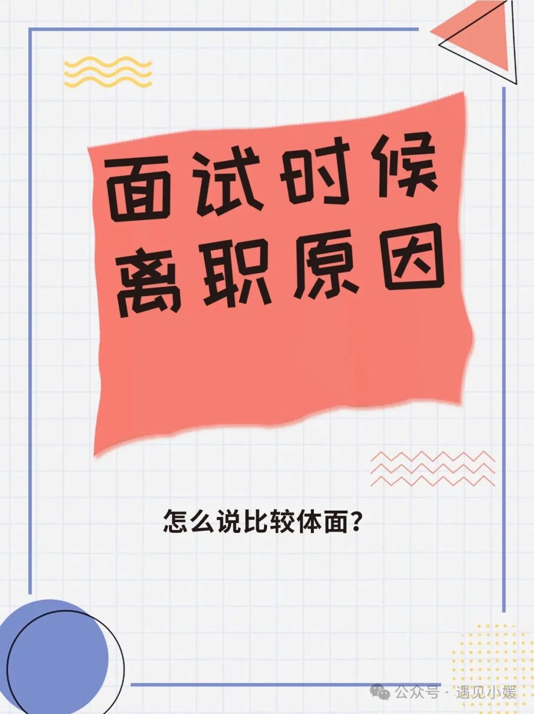面试时候离职原因怎么说比较体面? 我当时说的是: 当下自己的能力无法胜任这份工作,觉得自己也不是很适合这份工作,所以想要辞职。 有申请离职的想法后,接下来就会有人找你谈话。 可能是你的上级,也可能是领导,也可能是HR,每个公司应该的离职流程应该不同,所以到时按程序办事就好。 离职遵从一个原则就是: 不要闹,更不要把关系搞得太僵,因为入职和离职都是个人选择,把原因、理由讲清楚就好。 只要没犯原则性错误,离职的时候也不会有太大压力。 记得自己离职的那天,还好好吃了一顿,庆祝了一番。 只要前期本来就是新人小白,没啥职场经验,能力也有待提高,其实换一下工作,试错成本是最小的,这时可塑性也是有点儿的。 第一份工作是很重要,但前提是一开始你找的工作,就与自己的职业规划契合。 那才会对你以后的工作,有参考作用。 如果一开始没找对,那辞职赶紧换下一份工作,也没什么吧。 主要还是看比较之下,自己更适合哪份工作,要是能找到一份双向奔赴的工作,那自然是最好的了。 所以,打算离职的时候,在用词上注意一下,表达一下这种意思就好。 毕竟,你要是真干不下去了,在原来的公司待着,效率也不太高,浑浑噩噩混日子,说不定领导还会时不时说你几句,那干的也不开心。 没必要,真没必要。 体面地说自己还存在不足,也能体面地离职。