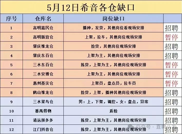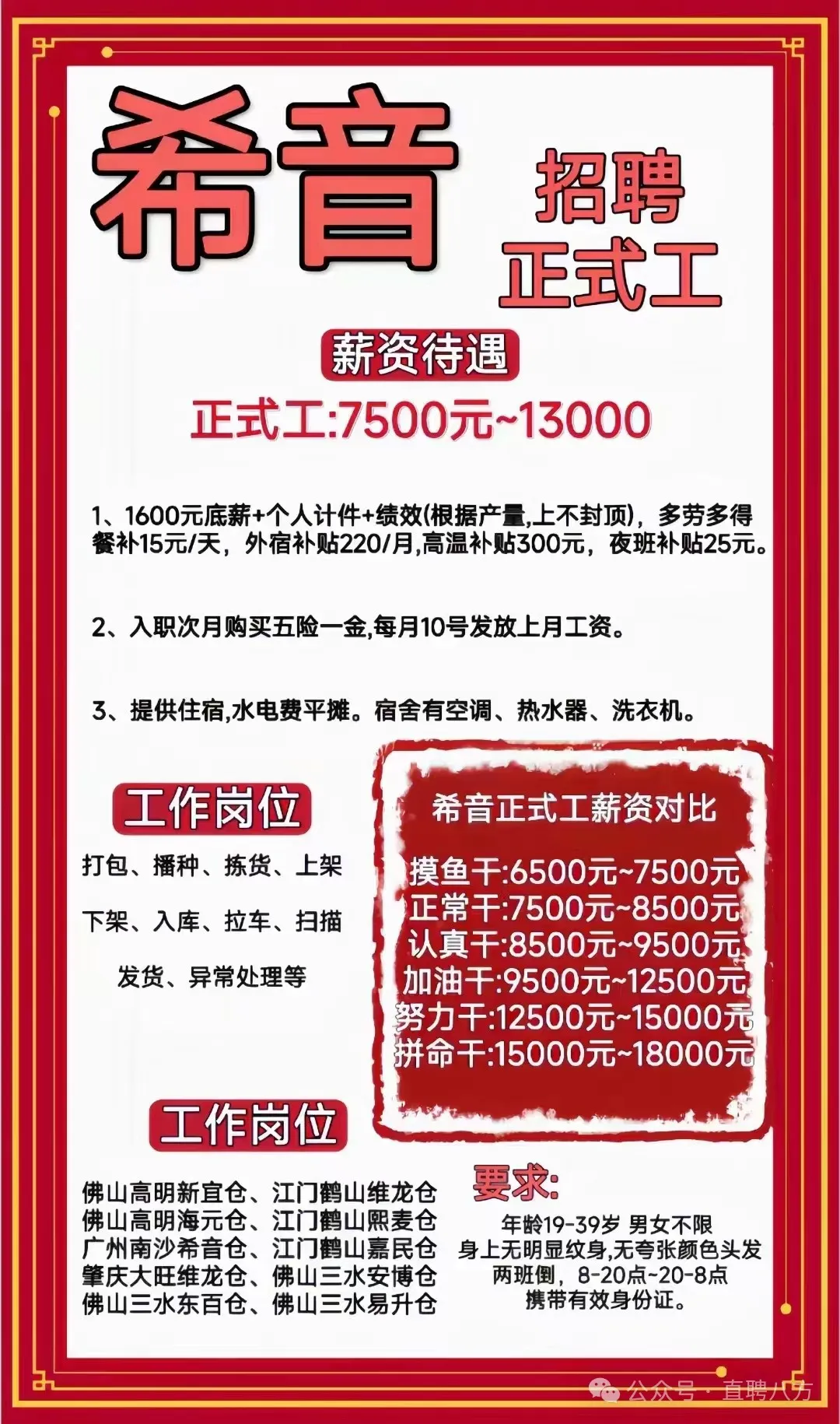 5🈷️12号音希物流新最安排 ✅江鹤门山 : 拣货、上架,拉车,播种,异常员(大学专历懂函数) ✅佛嘉山民仓 : 播种、发货、拉车 ✅肇庆大旺维龙仓:捡货,上下架 明天肇庆维龙仓:上架,拣货 东百仓:上架,拉车 要预约发我名字和电话号码,具体私聊 1️⃣江门鹤山维龙仓库❇️正式工招聘 2️⃣江门鹤山嘉民仓库❇️正式工招聘 3️⃣江门鹤山熙麦仓库❇️正式工招聘 4️⃣佛山高明新宜仓库❇️正式工招聘 5️⃣佛山高明嘉民仓库❇️正式工招聘 6️⃣佛山三水东百仓库❇️正式工招聘 7️⃣佛山三水安博仓库❇️正式工招聘 8️⃣肇庆大旺维龙仓库❇️正式工招聘 9️⃣惠州博罗基实仓库❇️正式工招聘 ❤温馨提示:当天面试,有安排宿舍入住 ❣️应聘要求: 1、 18-39岁,男女不限,不要学生。 2、持有本人有效身份证(不接收消磁身份证、临时身份证等证件); ❣️薪资待遇: 1、1600 底薪+加班费+个人计件+绩效,多劳多得,综合薪资 7500-13000; 3、餐补15元/人/天,提供住宿 (外宿补贴 220/月),空调热水器洗衣机都有,入住需要交住宿押金230元,水电平摊, 4、入职次月购买当地五险一金; 5、每月 10 号发放上月工资,公司可统一办工资卡。 6、新员工入职打卡一个星期都可预支1000元生活费。