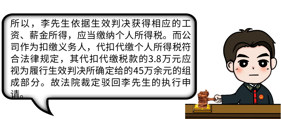 在劳动争议案件中,法院判决公司支付给劳动者的薪资,是税前还是税后的金额?公司应不应该替劳动者代缴个税呢?近日,福建省一法院驳回了一个当事人对部分薪资的执行申请,并由此推出了在部分法律文书主文后嵌入纳税提示的“微创新”举措。 李先生(化名)是某科技公司总监, 因不满公司单方面解除劳动合同, 便起诉至厦门市思明区人民法院, 要求公司支付其工资差额 及补偿金额等。 法院判决公司应向李先生 支付工资、违法解除劳动合同的赔偿金 等共计45.4万元, 判决生效后, 公司支付了李先生税后薪金41.6万余元。 案件虽然审结, 却引发了法官们的思考: 依据《中华人民共和国税收征收管理法》规定,如果扣缴义务人应扣未扣的,税务机关除向纳税人追缴税款外,还应对扣缴义务人处以相应的罚款。也就是说,本案中公司代李先生缴纳个人所得税是法定义务,公司如若没有代为扣缴,将需要承担相应的法律责任。 那么, 怎么让当事人了解纳税义务呢? 厦门市税务局政策法规处处长 陈劲松 在部分裁判文书后嵌入纳税提示的创新性做法将进一步搭建起司法部门、税务部门和税收相对人之间良好的沟通桥梁,通过及时沟通反馈,形成税务执法与司法审判的良性互动。 厦门大学法学院副教授 李刚 在民事执行中代扣代缴税款的部分是否构成执行款,在理论和实务界均有不同的观点。思明法院通过一个执行案件的办理,既给出了实务界的答案,又总结出在裁判文书后嵌入纳税提示的“微创新”,值得点赞。 复旦大学法学院教授 许多奇 思明法院在部分裁判文书后嵌入纳税提示的创新性做法,能够促进纳税主体依法纳税,更广泛地宣传纳税义务,也能更精准提示当事人履行纳税义务。 思明法院党组书记、院长 黄冬阳 在部分裁判文书后嵌入纳税提示,是涉税案件集中管辖改革成果的进一步延伸、也是司法部门主动靠前,为当事人提供涉税司法服务的创新举措。 法条链接 《中华人民共和国个人所得税法》第二条第一款第一项规定:“下列各项个人所得,应当缴纳个人所得税:(一)工资、薪金所得;(二)劳务报酬所得;(三)稿酬所得;(四)特许权使用费所得;(五)经营所得;(六)利息、股息、红利所得;(七)财产租赁所得;(八)财产转让所得;(九)偶然所得。” 《中华人民共和国个人所得税法》第九条第一款规定:个人所得税以所得人为纳税人,以支付所得的单位或者个人为扣缴义务人。 |