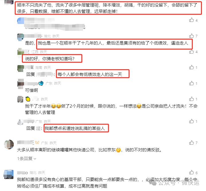 二、人才流失应反思 随着环境的变化与组织的不断调整,不少顺丰的干将跳槽或另谋它就,从另一角度来说,这同时也为行业做出出人才贡献。 原文的留言挺精彩: